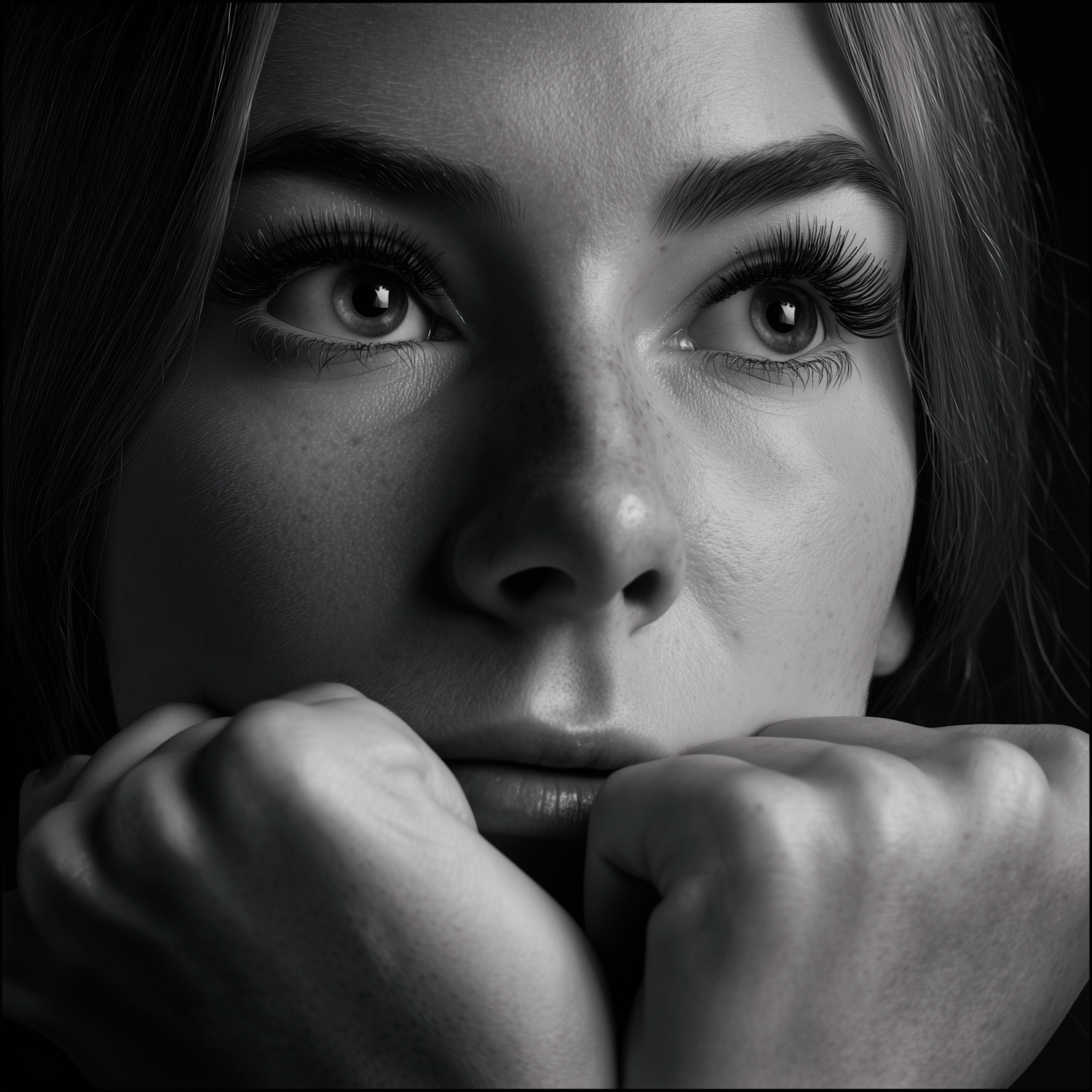 Black-and-white close-up of a contemplative person with freckles, resting their chin on their hands, with dramatic lighting.