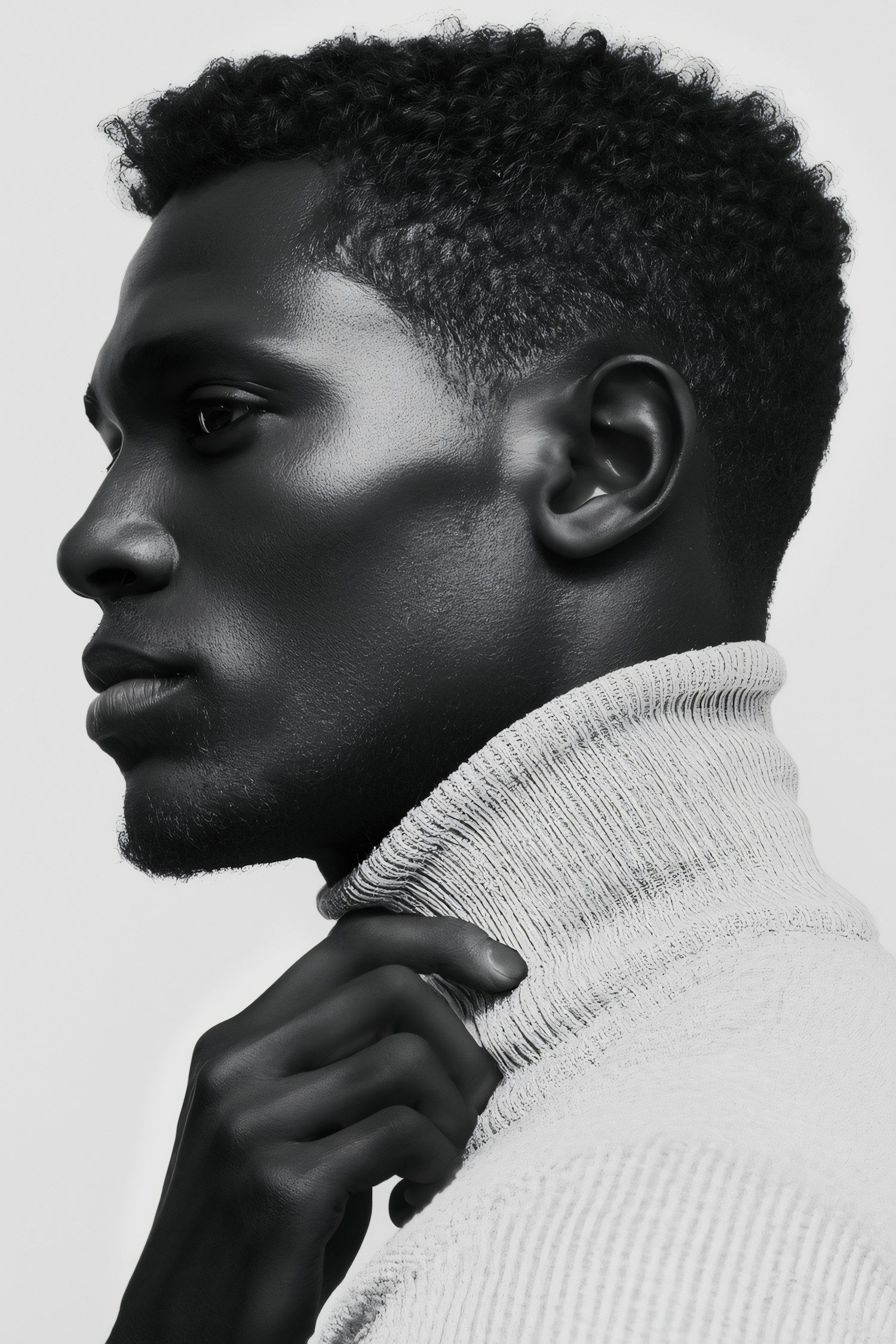 Monochrome profile portrait of a man in a textured turtleneck, highlighting facial contours and fabric details.