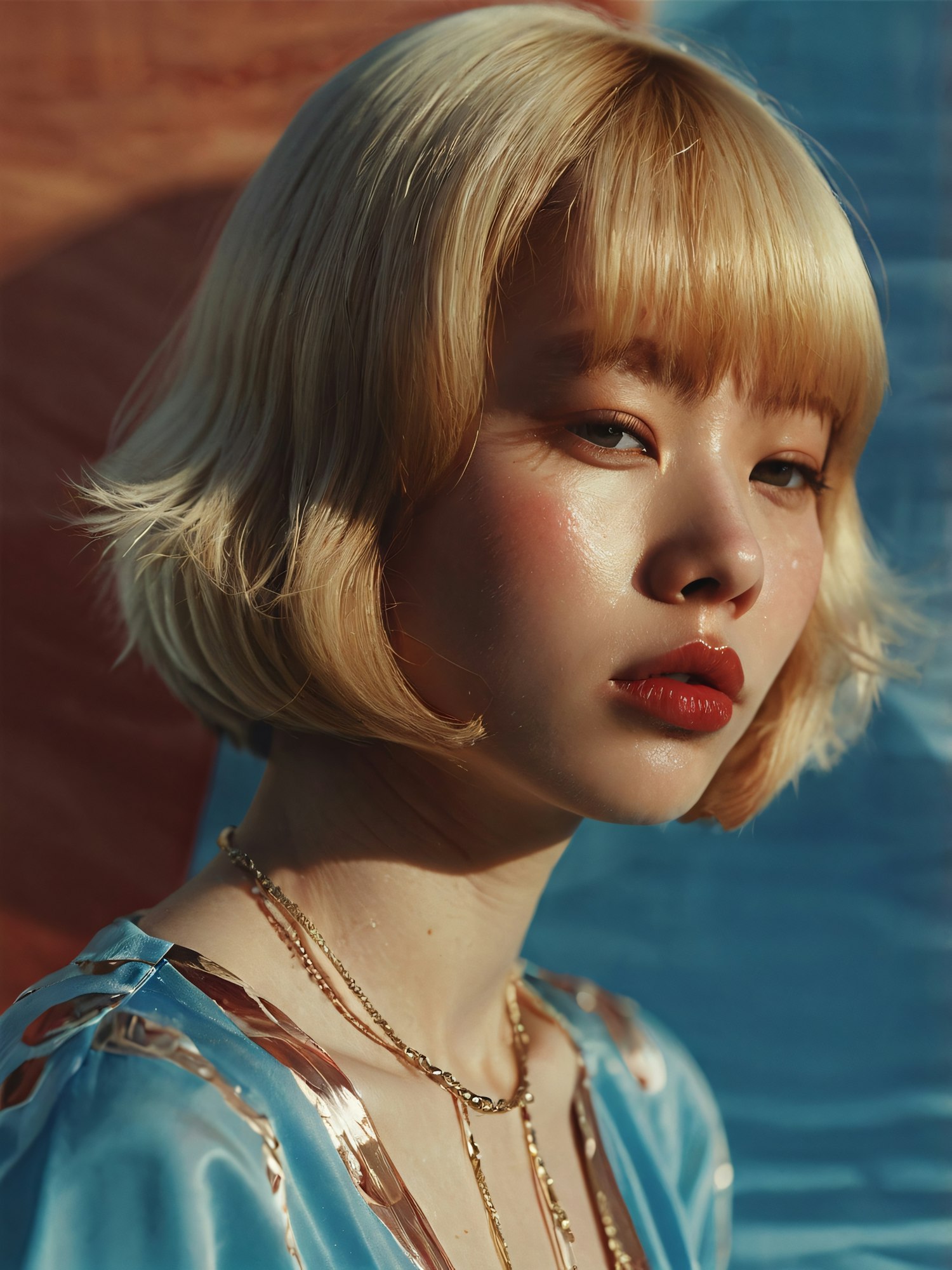 Stylish blonde bob haircut with elegant blue attire and gold chains, set against a warm and cool toned background.