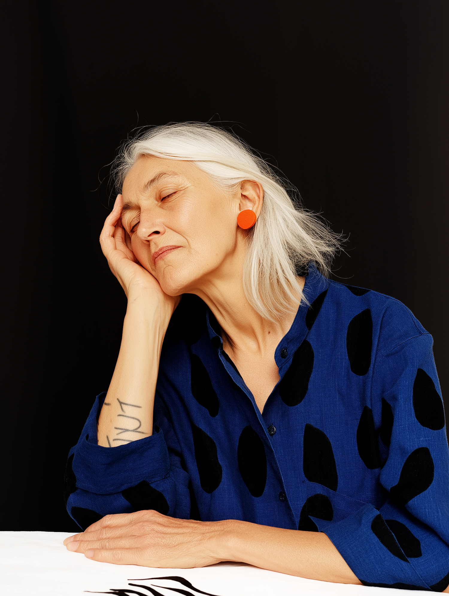 A serene portrait of a mature woman in a blue polka-dot shirt, orange earrings, and a tattoo, set against a black background.