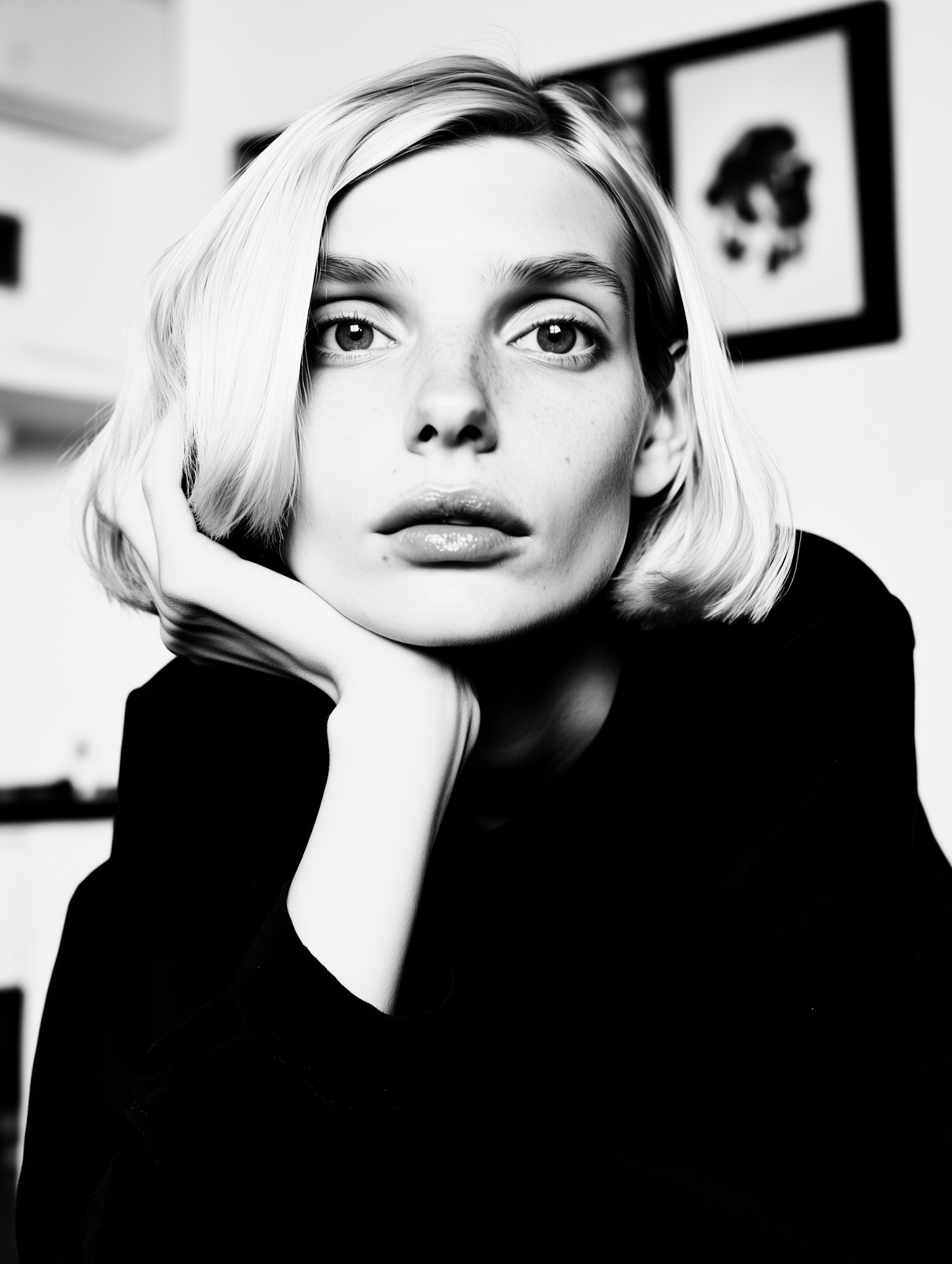 Black-and-white portrait of a woman with short blonde hair, resting her face on her hand, with a contemplative gaze and blurred background.