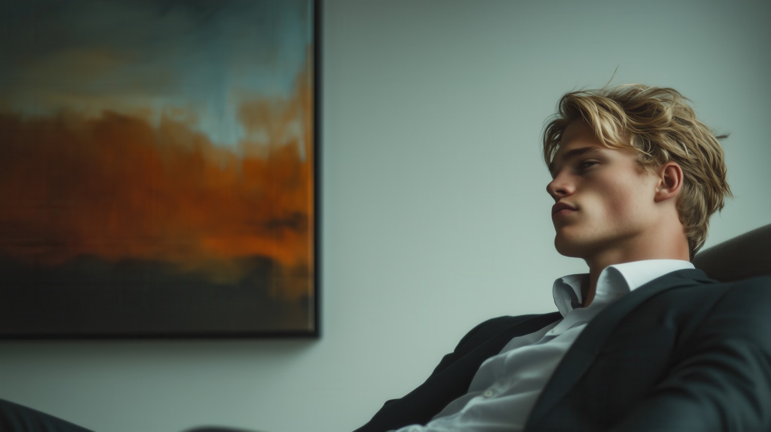 Blonde man in a dark suit sits pensively against a blurred abstract painting with warm orange and blue tones.