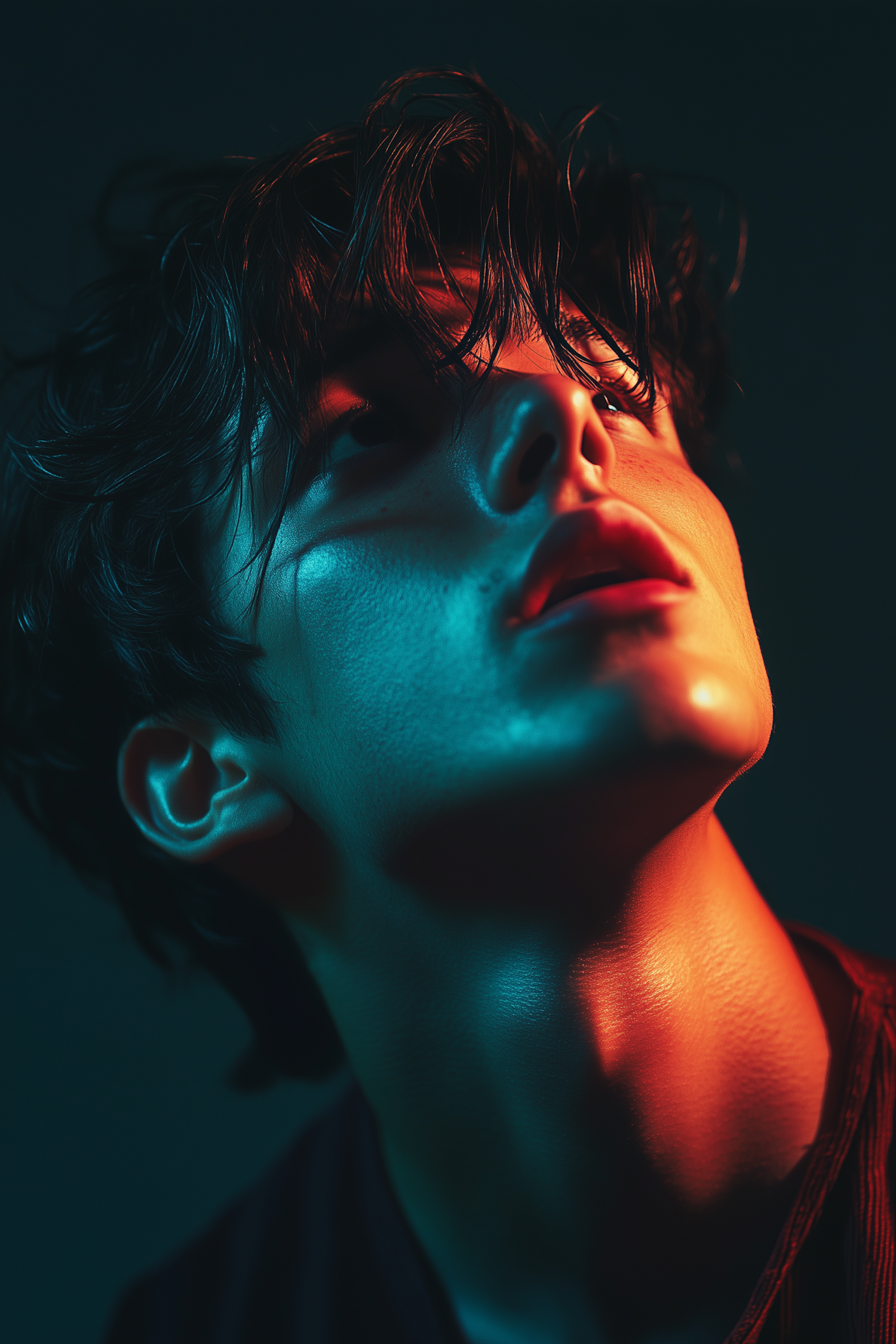 Dramatic portrait of a young man with teal and orange lighting, creating a cinematic and contemplative atmosphere.