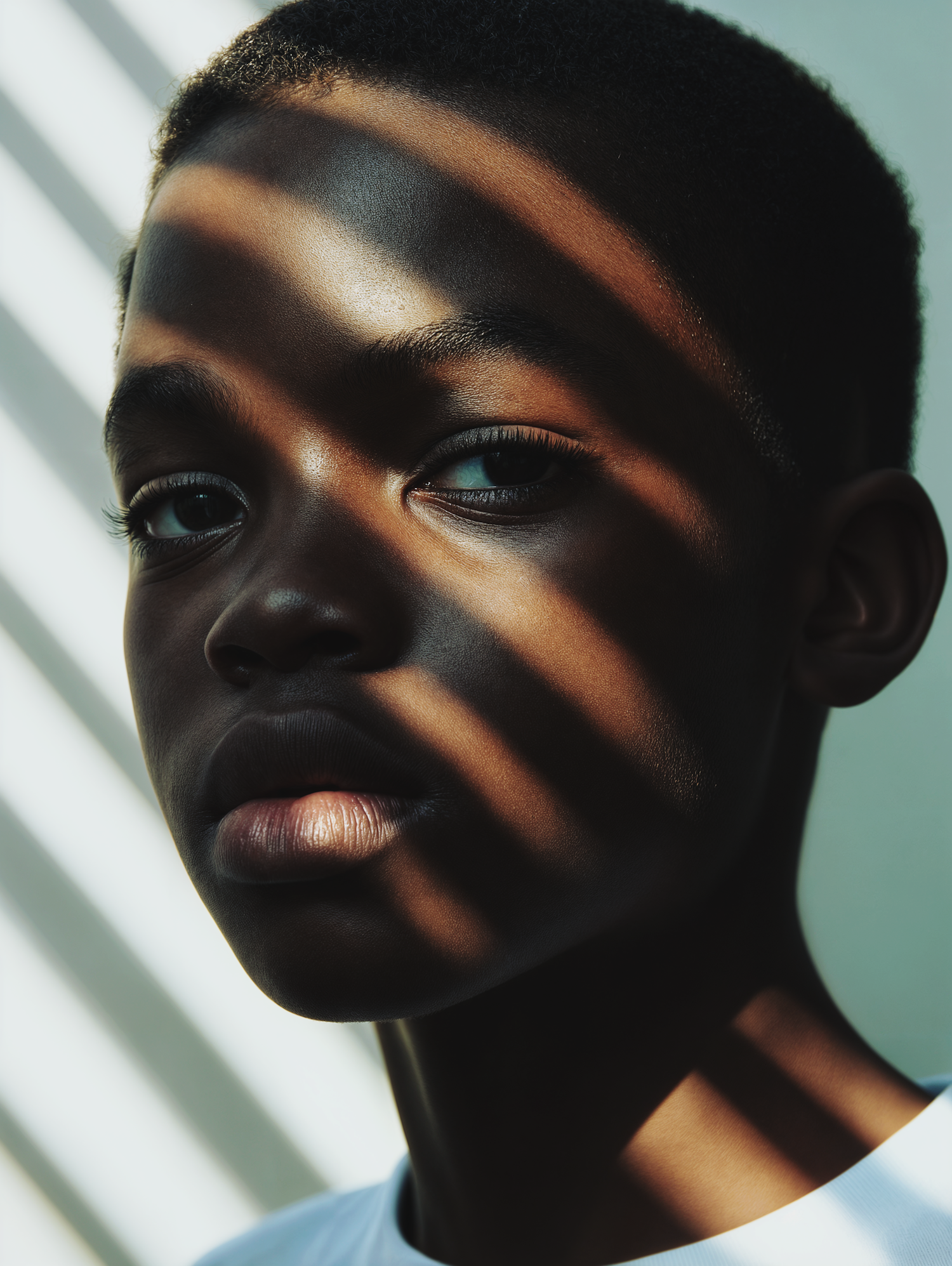 A young boy's face is beautifully lit with dramatic shadows, creating a striking and introspective portrait.