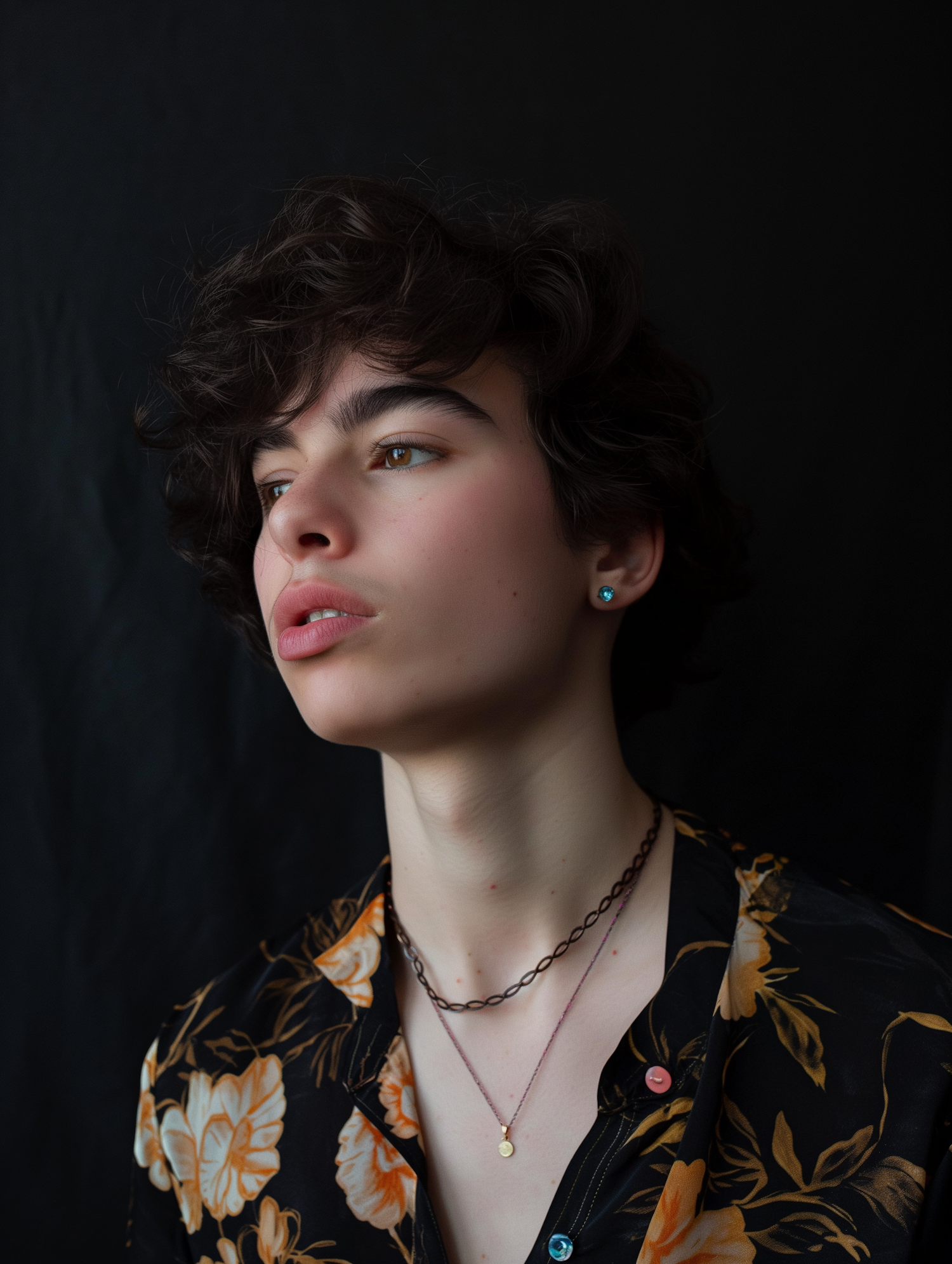 Young person with curly hair and floral shirt gazes thoughtfully, wearing a blue earring and layered necklaces against a dark background.
