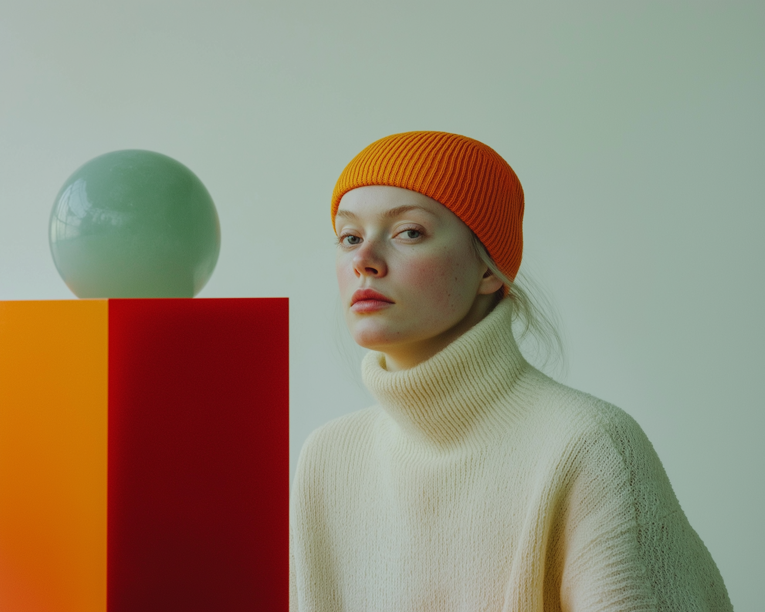 Minimalist portrait of a woman in an orange beanie and cream sweater, paired with geometric shapes in red, orange, and green.