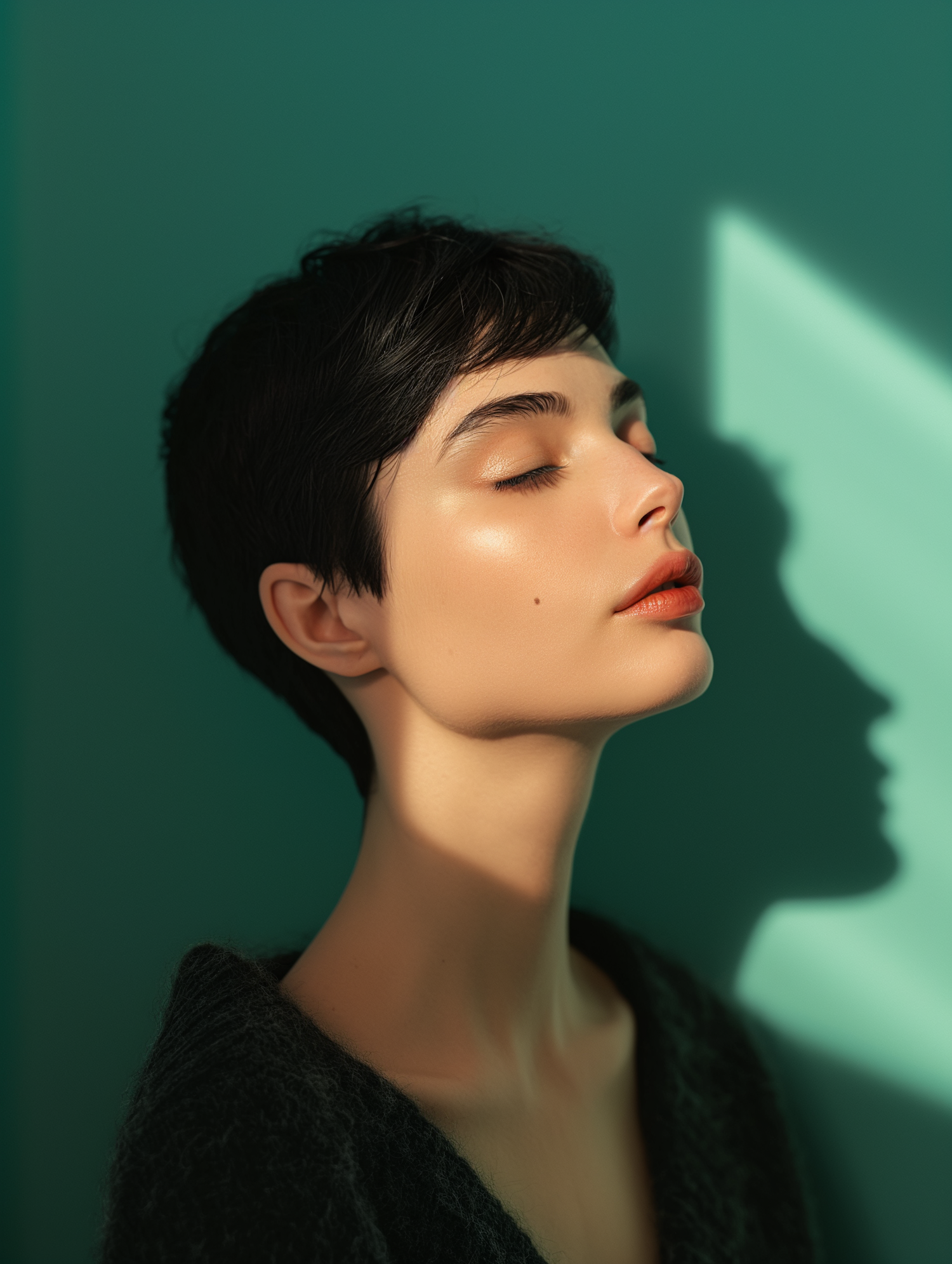 Serene portrait of a young woman with short dark hair against a teal background, eyes closed, basking in soft light.