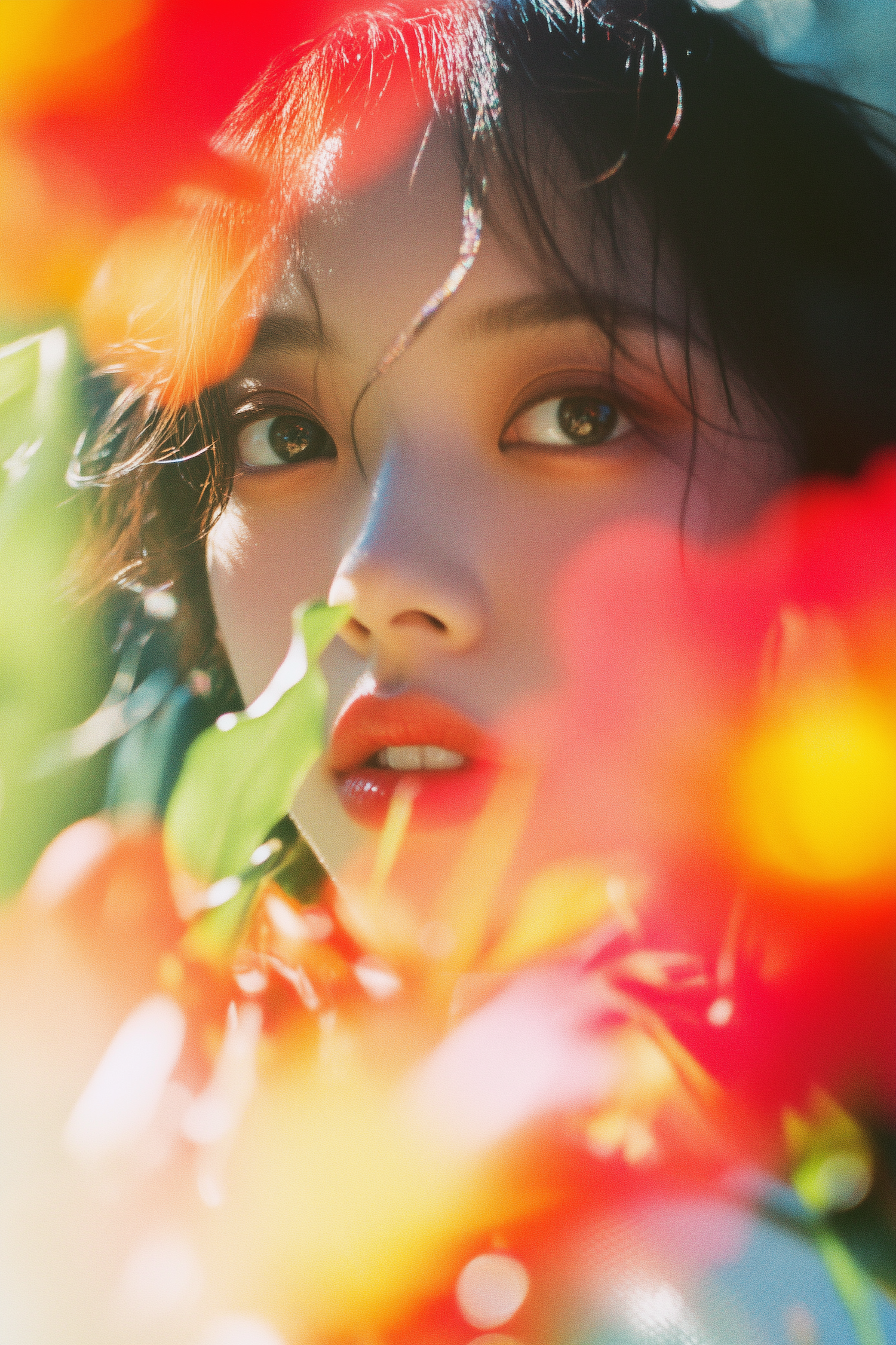 Close-up of a woman with flowers, capturing a dreamy, ethereal vibe with vibrant colors and soft lighting.