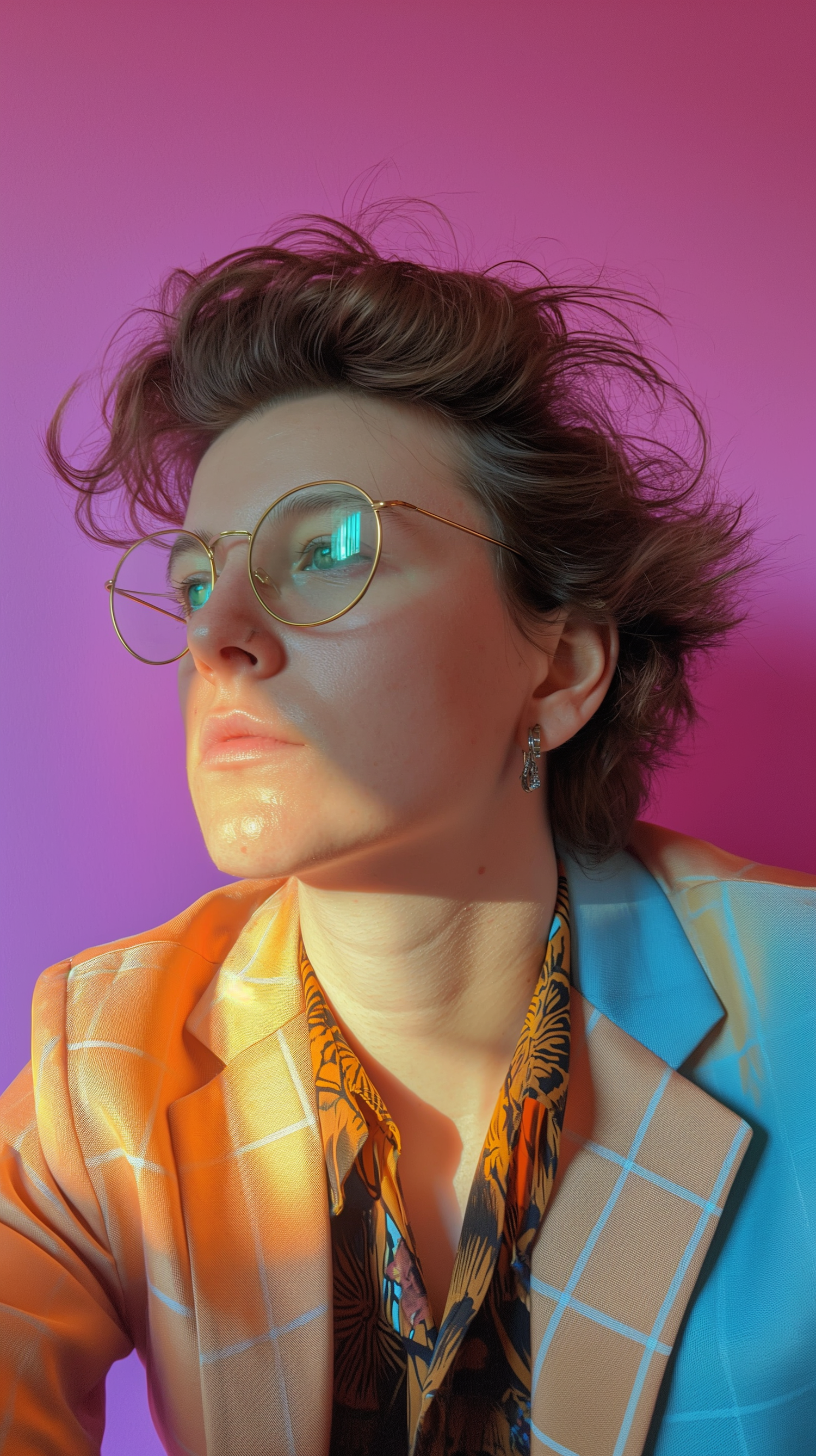 Stylish portrait of a person in glasses with a colorful outfit against a pink gradient background, exuding modern elegance.