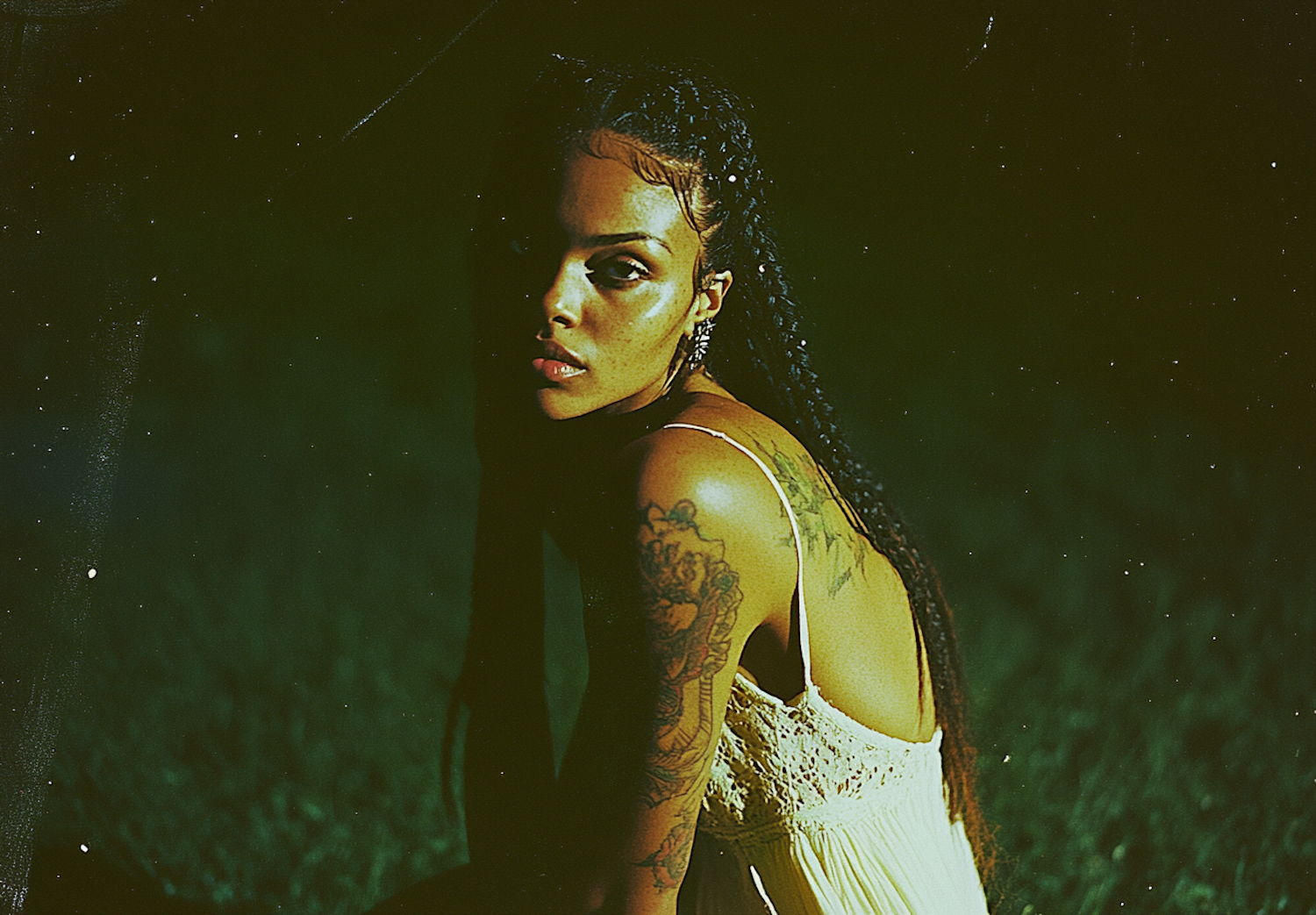 A woman with long braids and a floral tattoo on her shoulder sits in a lace dress against a dark, moody background.