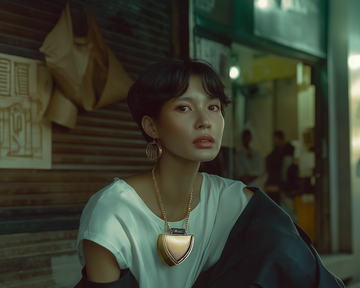 Asian woman with short hair in urban setting, wearing white top and bold jewelry, gazes thoughtfully. Moody, dimly lit background.
