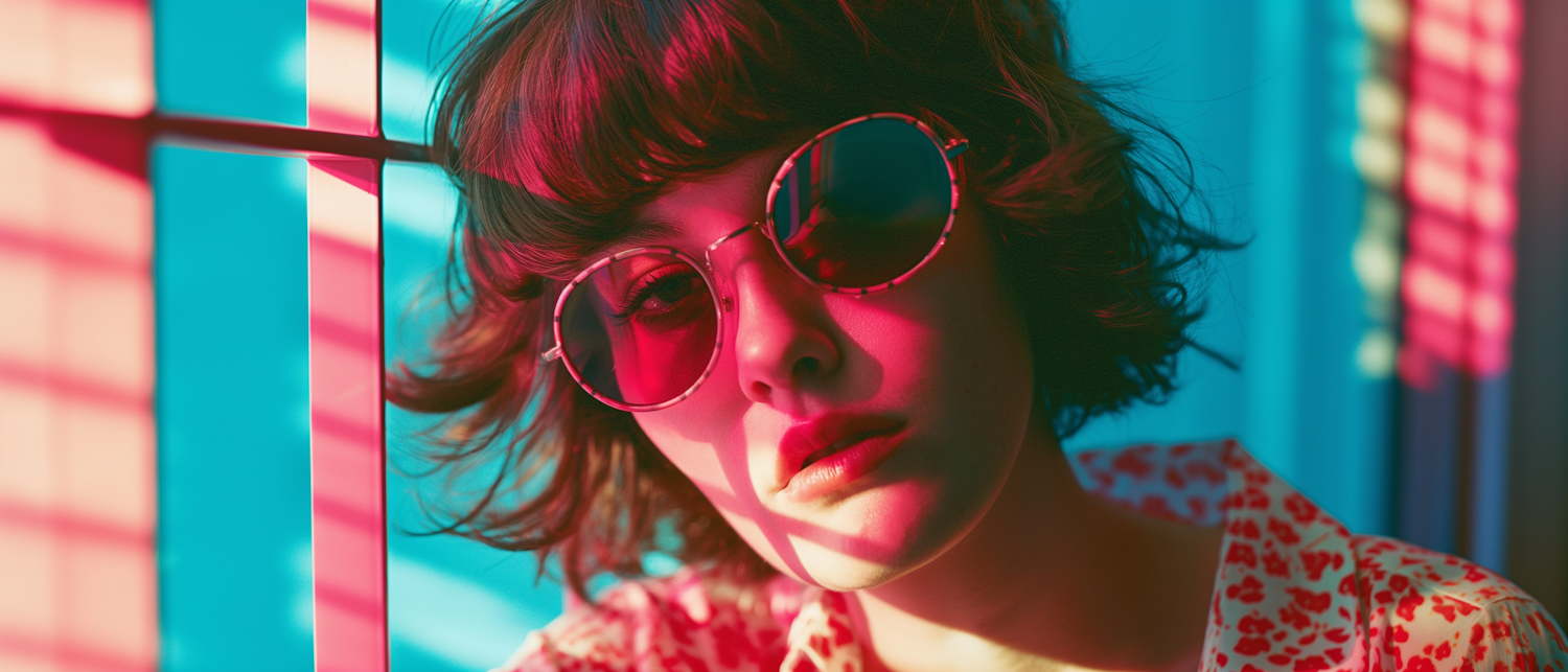 Stylish woman in red-tinted sunglasses with dramatic lighting, wearing a floral shirt. Vibrant red and blue hues create a striking contrast.
