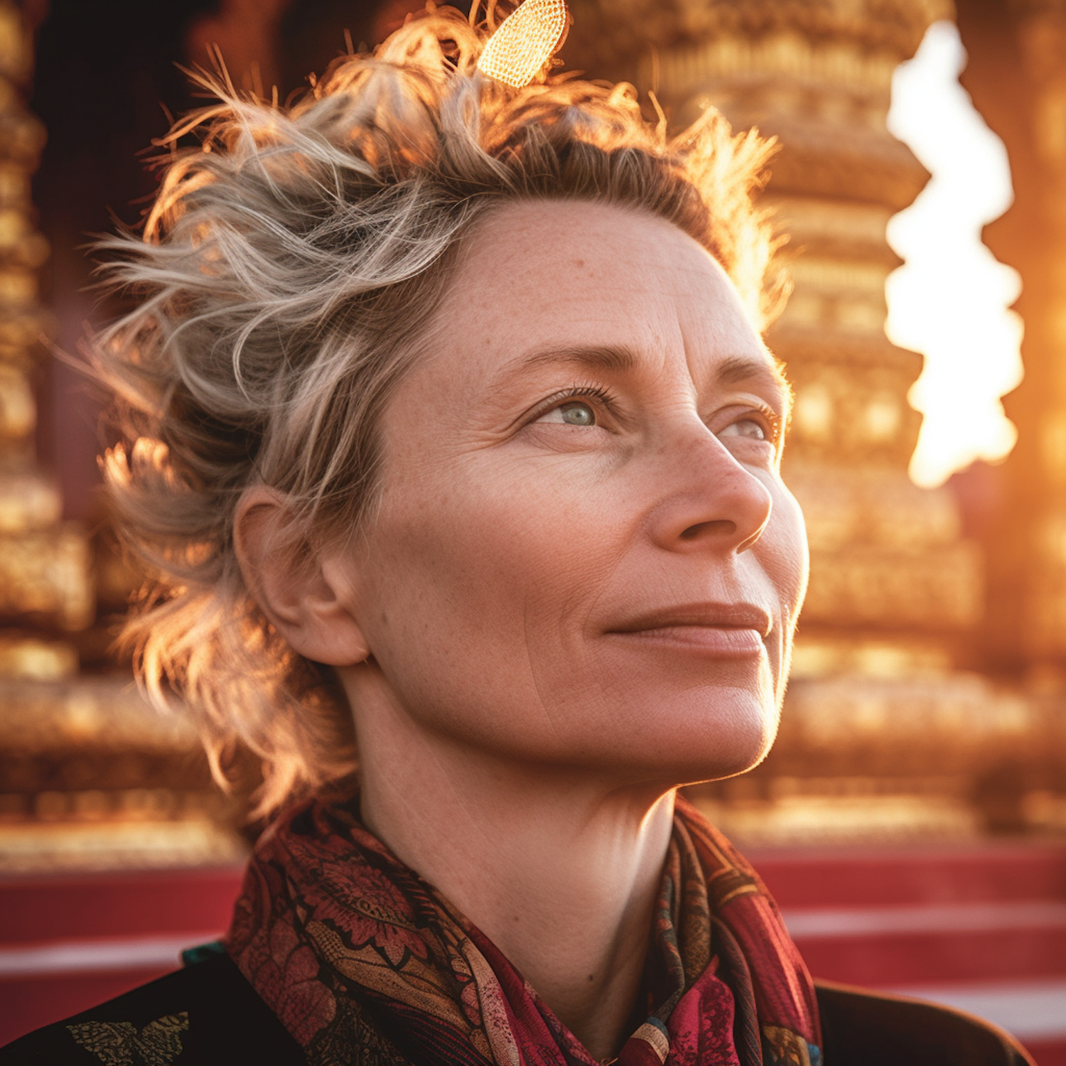 Caucasian woman with short blonde hair gazes thoughtfully, wearing a patterned scarf. Golden sunlight and temple background create a serene mood.