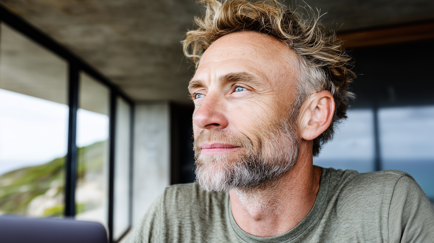 A thoughtful man with blue eyes and a short beard gazes out of a window, with a scenic natural background visible through the glass.