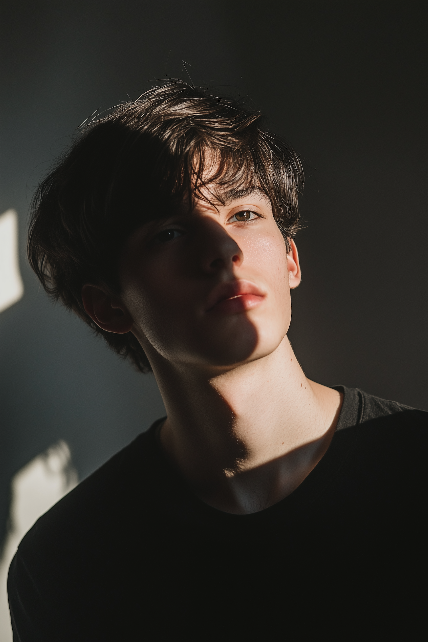 Moody portrait of a young man with dramatic lighting and shadows, highlighting his contemplative expression and tousled dark hair.
