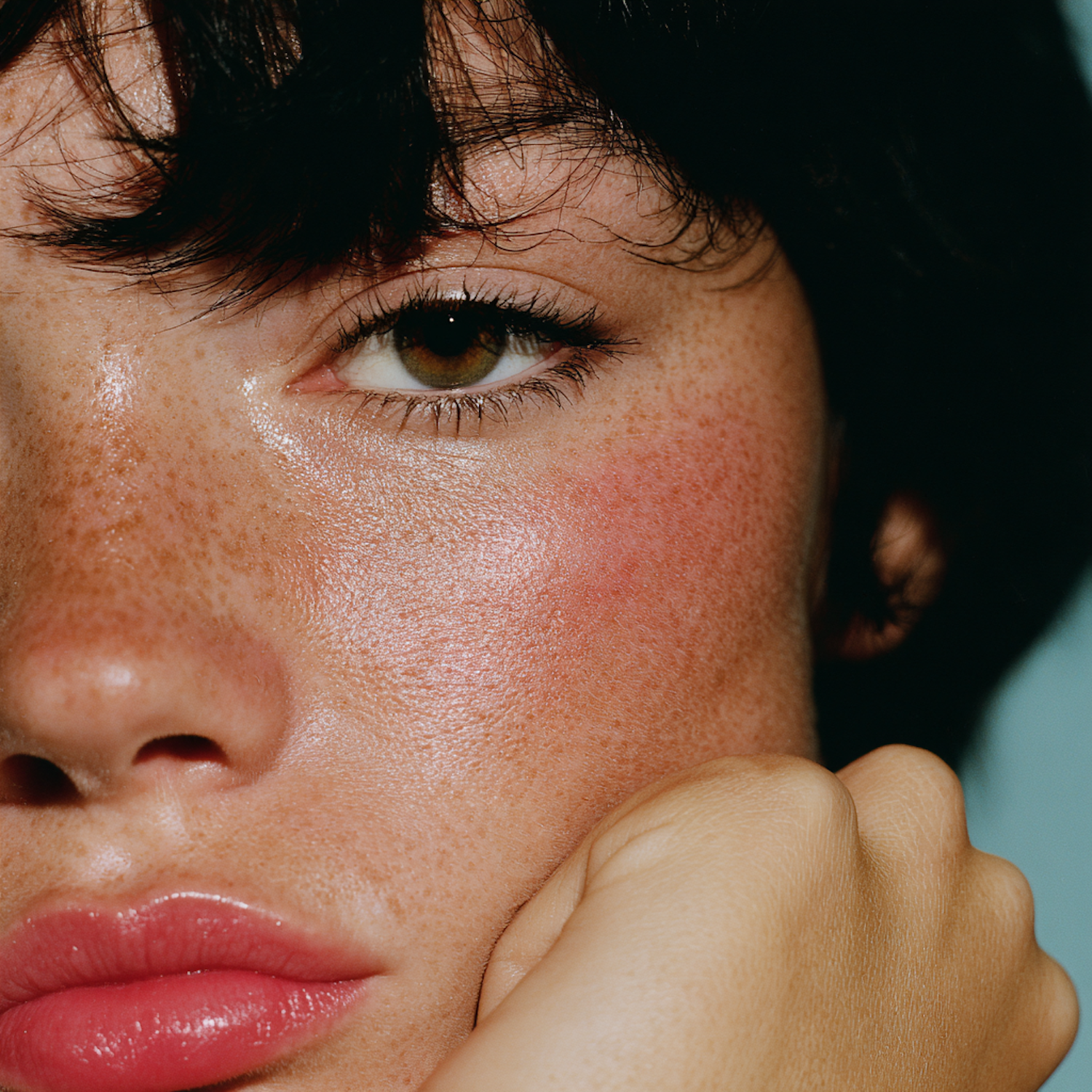 Close-up of a freckled face with green eyes, glossy pink lips, and short dark hair, showcasing natural beauty and skin texture.