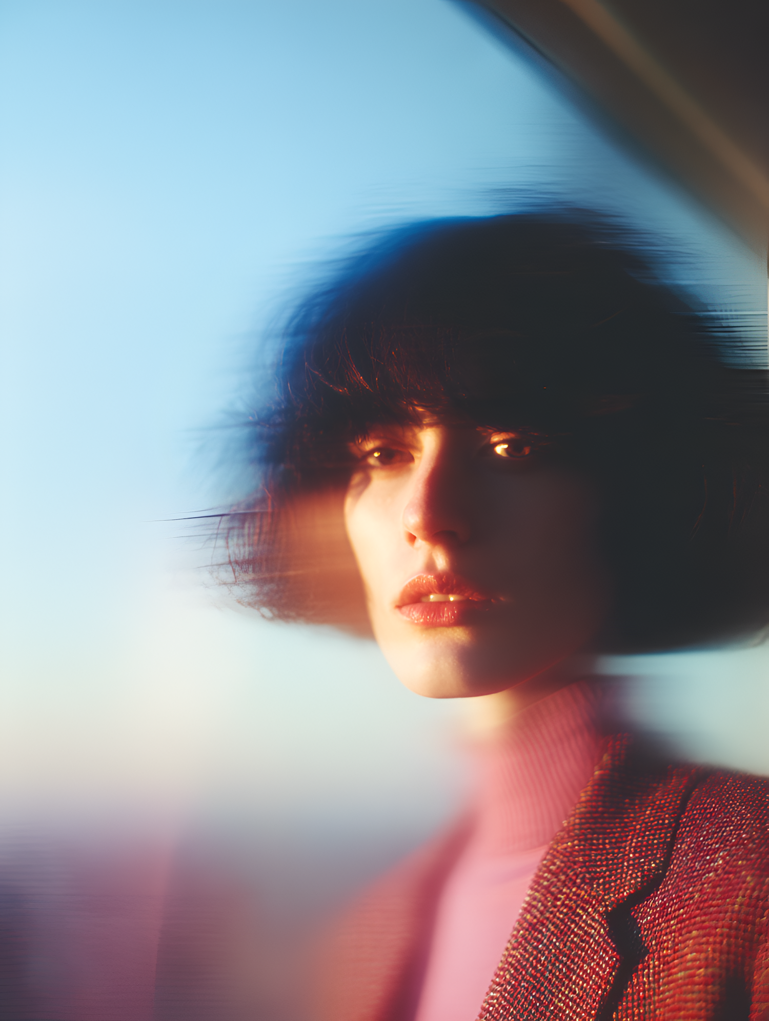 A dreamy portrait of a person in warm lighting, wearing a red jacket and pink turtleneck, with a soft blue background.