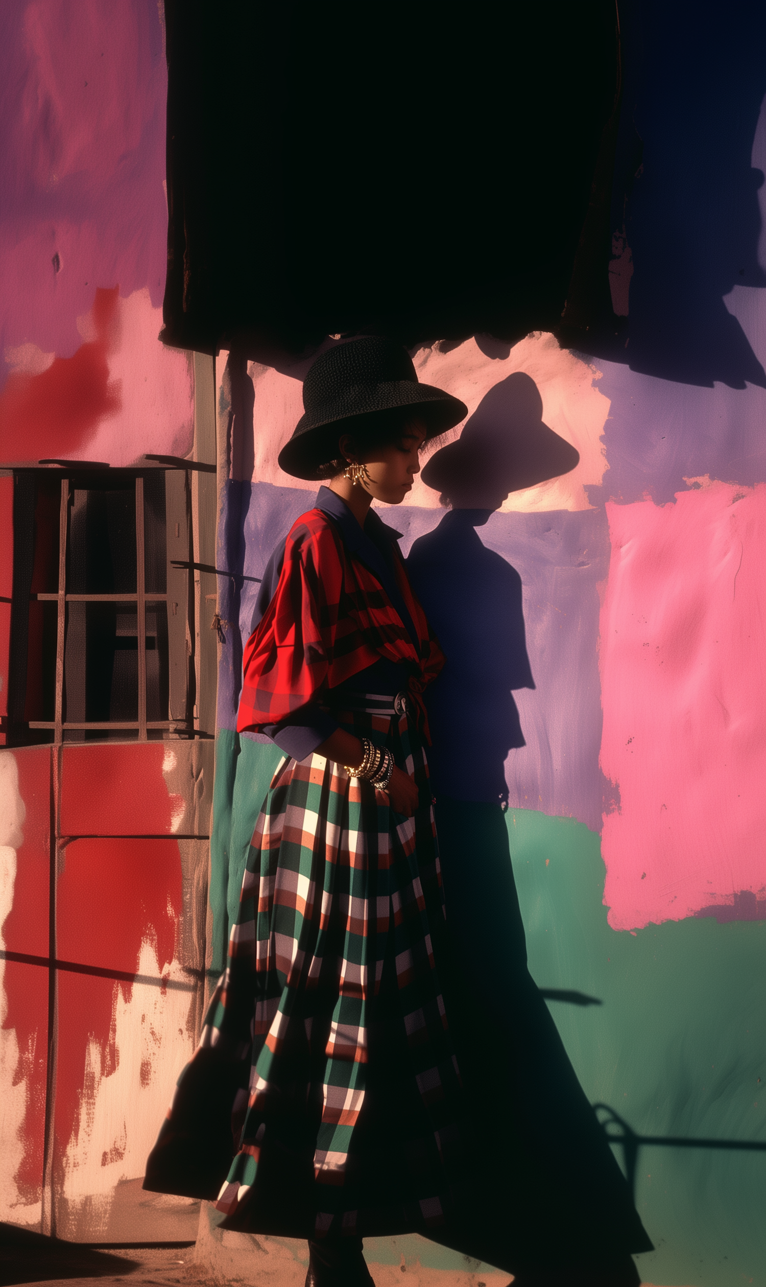 Woman in plaid outfit and black hat stands against a colorful wall, casting a shadow. Bold colors and stylish accessories create a striking scene.