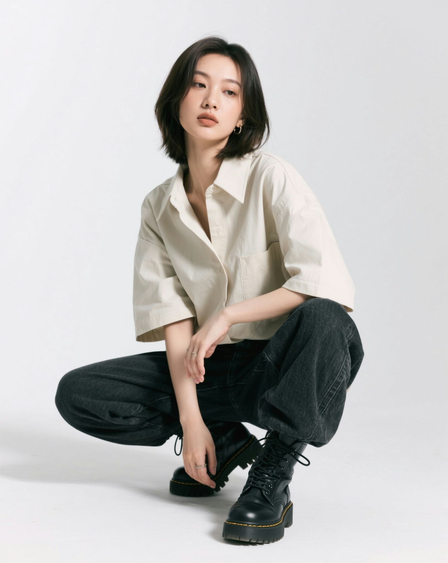 Asian woman in a studio streetwear photoshoot, crouching on one knee with relaxed posture. Wearing an oversized neutral-toned shirt, dark loose-fit jeans, and chunky black combat boots. Hair styled in a short bob with soft strands framing the face. Clean white background, minimalist street style aesthetic, natural confident expression, editorial fashion photography.