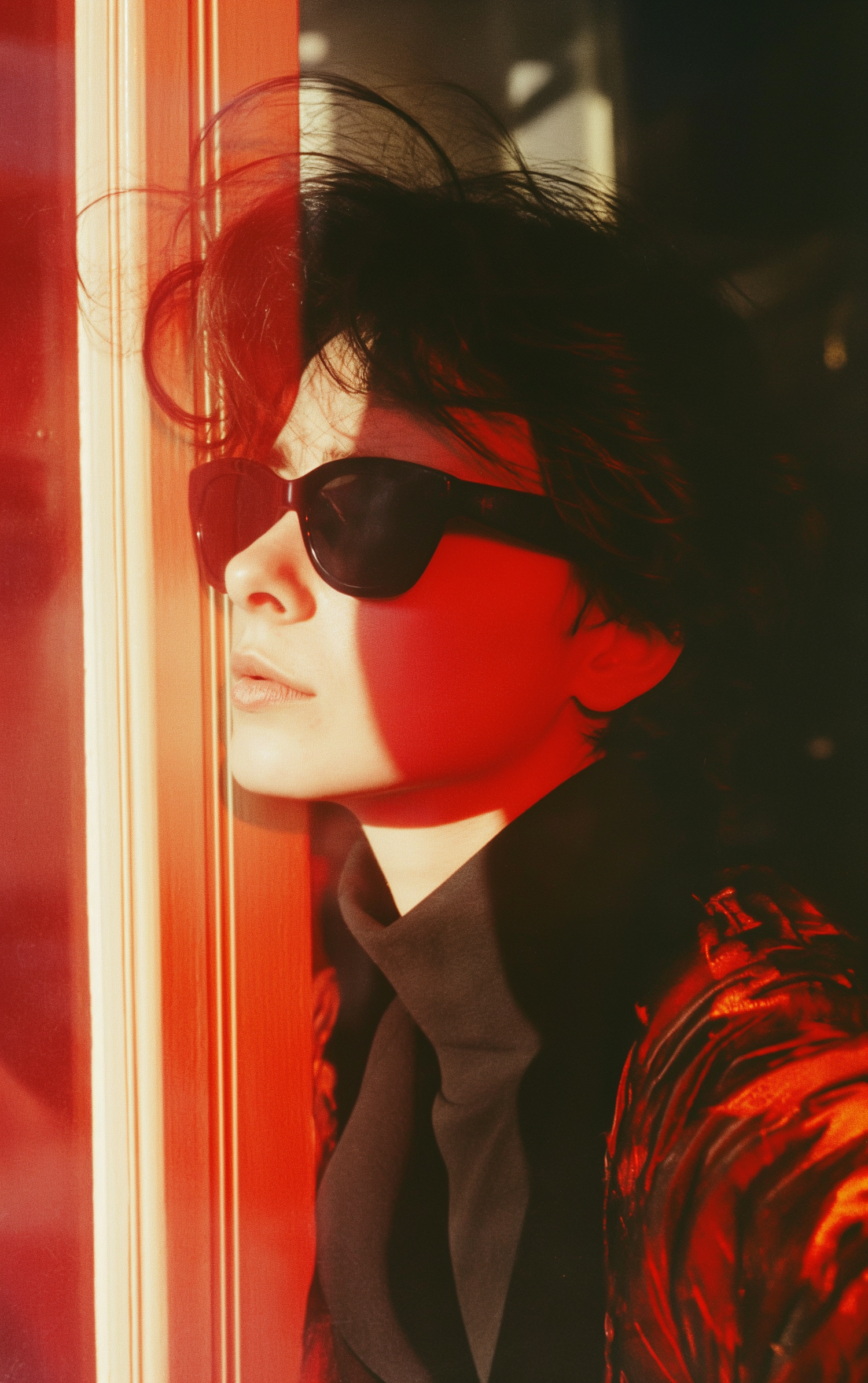 Person in black sunglasses and turtleneck, bathed in dramatic red light, creating a mysterious and intense atmosphere.