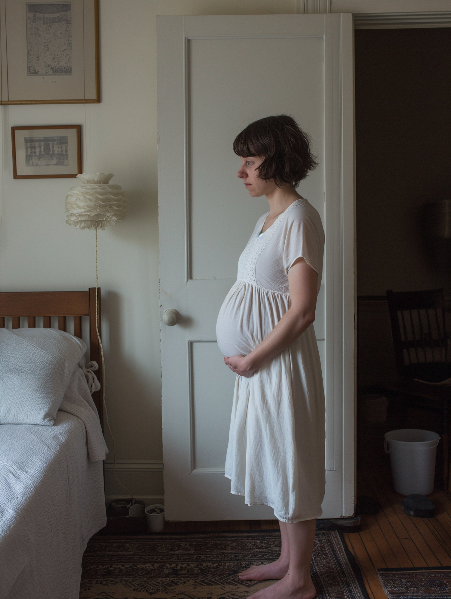 Pregnant woman in white dress stands in serene room, cradling belly. Soft lighting, framed art, and cozy decor create a peaceful atmosphere.
