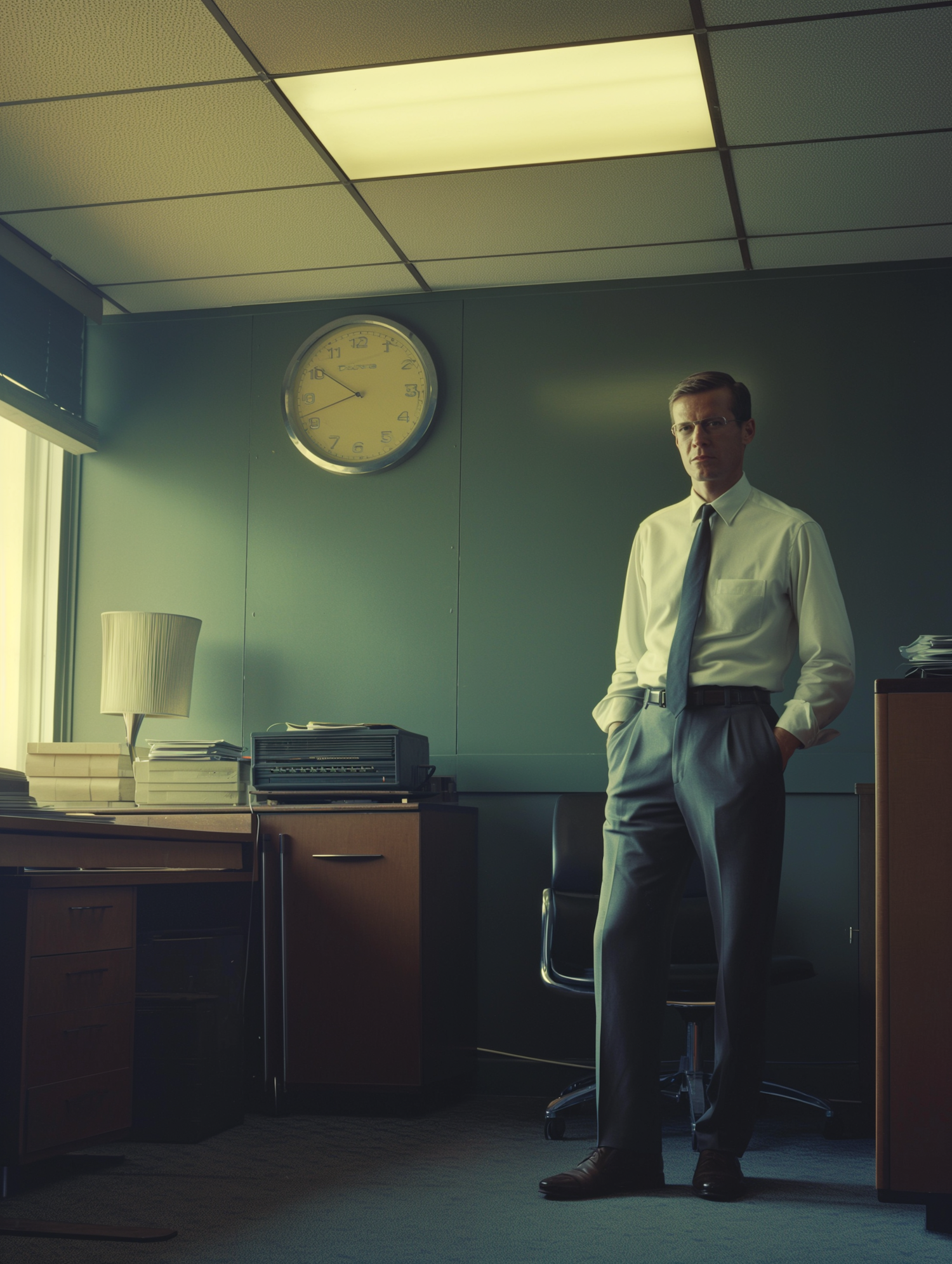 A man in a vintage office setting, wearing a white shirt and tie, stands with hands in pockets. A wall clock and desk add to the retro vibe.