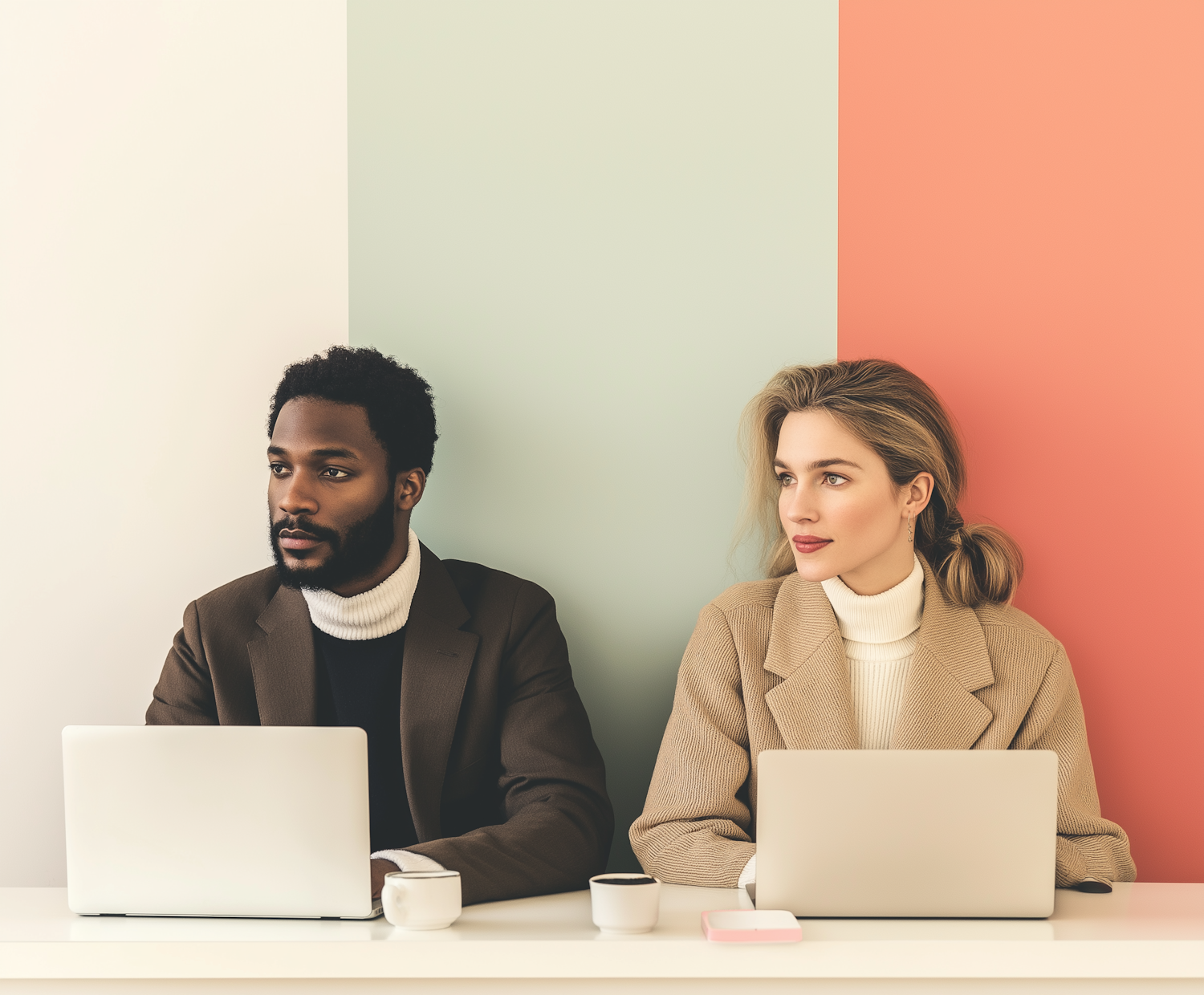 Two professionals with laptops sit against a stylish color-blocked background, exuding modern elegance and focus.