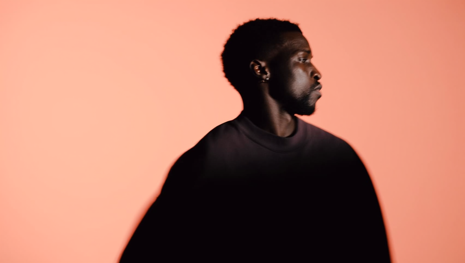 A man with short hair and a beard, wearing a dark shirt, is seen in profile against a peach background, creating a striking contrast.