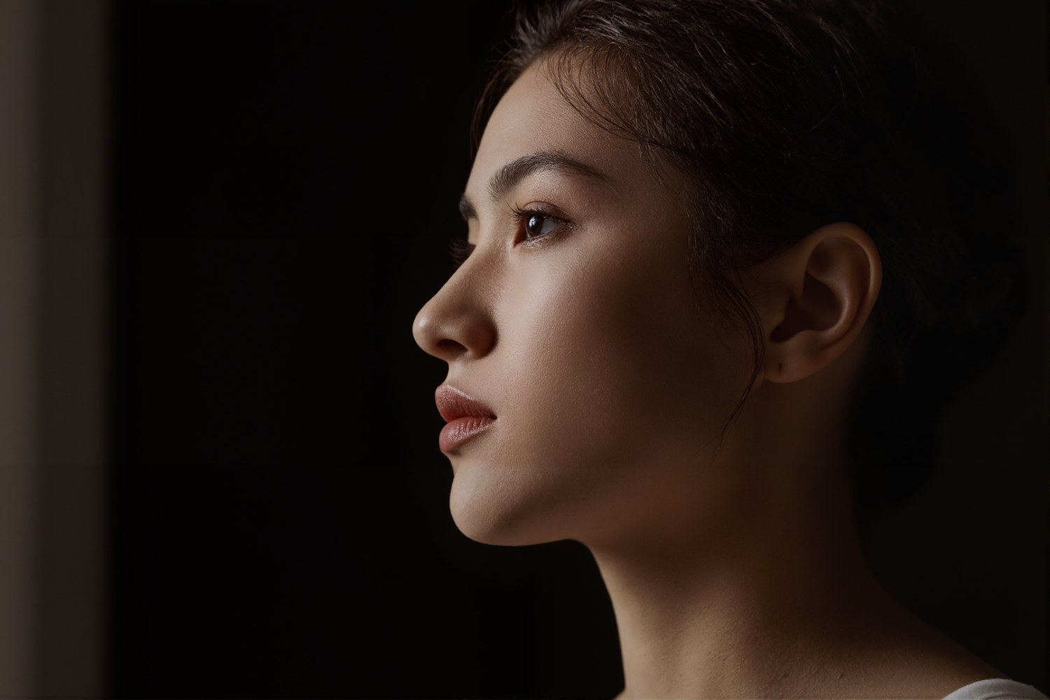 Profile of a young Asian woman with fair skin against a dark background, highlighting her delicate features and contemplative expression.