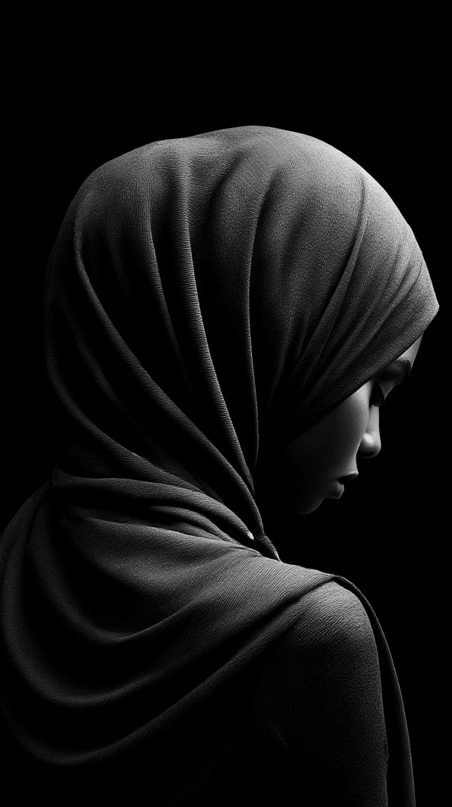 A striking monochrome portrait of a person in a textured headscarf, captured in profile with dramatic lighting against a black background.