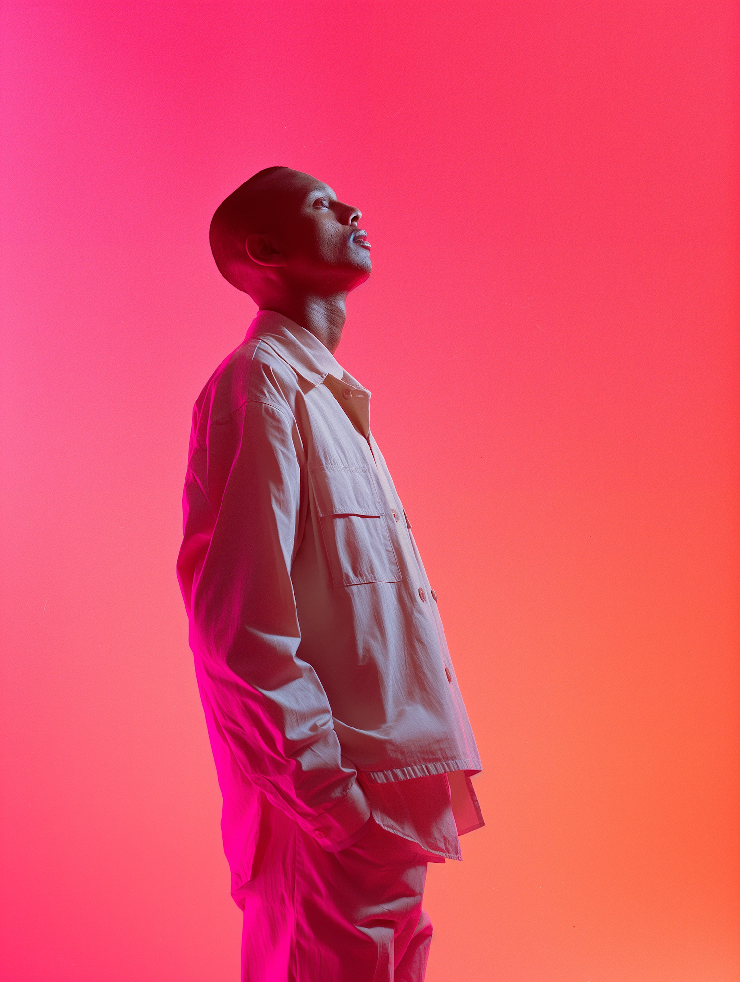 Profile of a man in light attire against a vibrant pink-orange gradient background, exuding calm and contemplation.