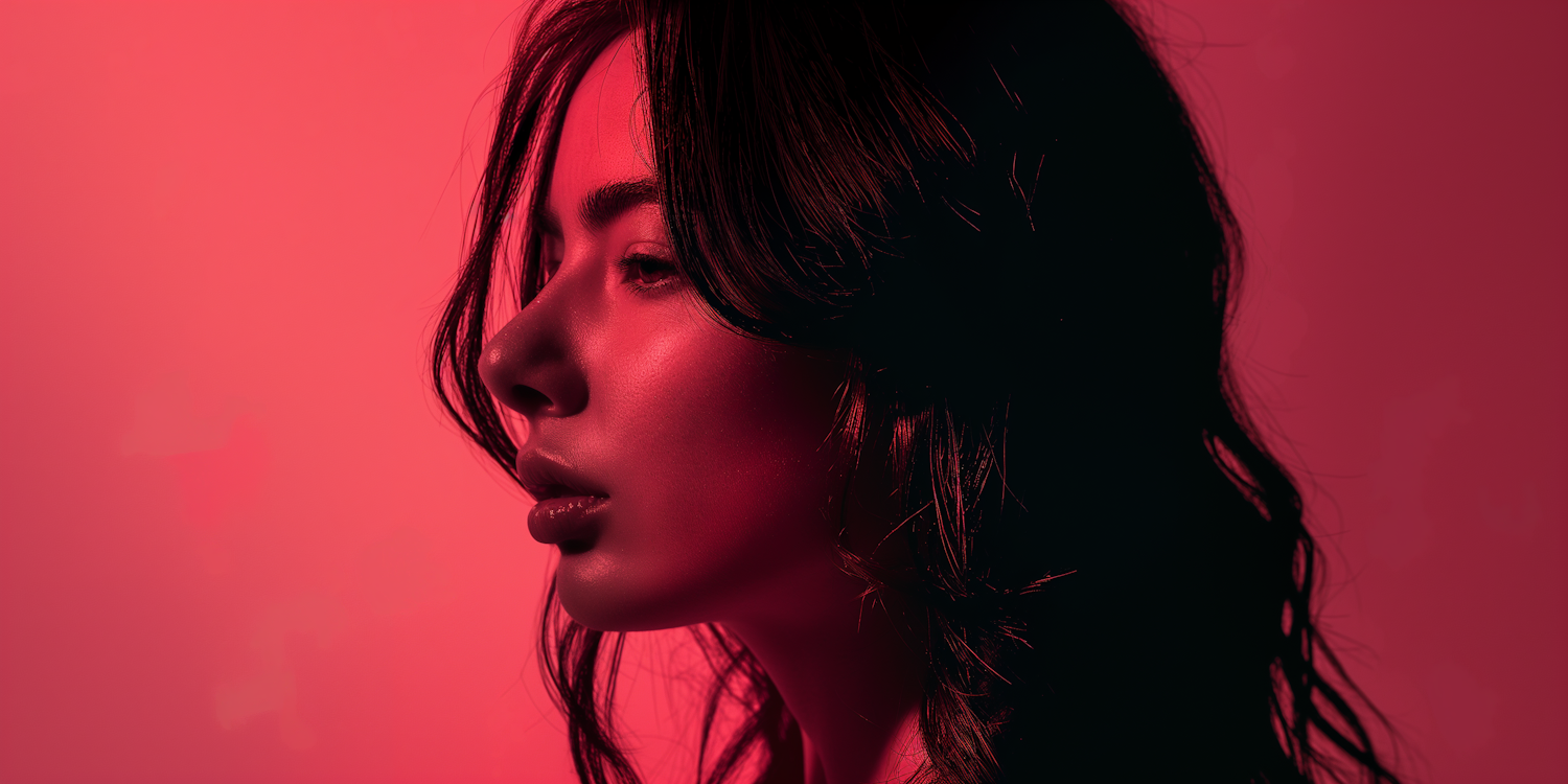 Profile of a woman with dark hair against a red background, highlighted by dramatic lighting.