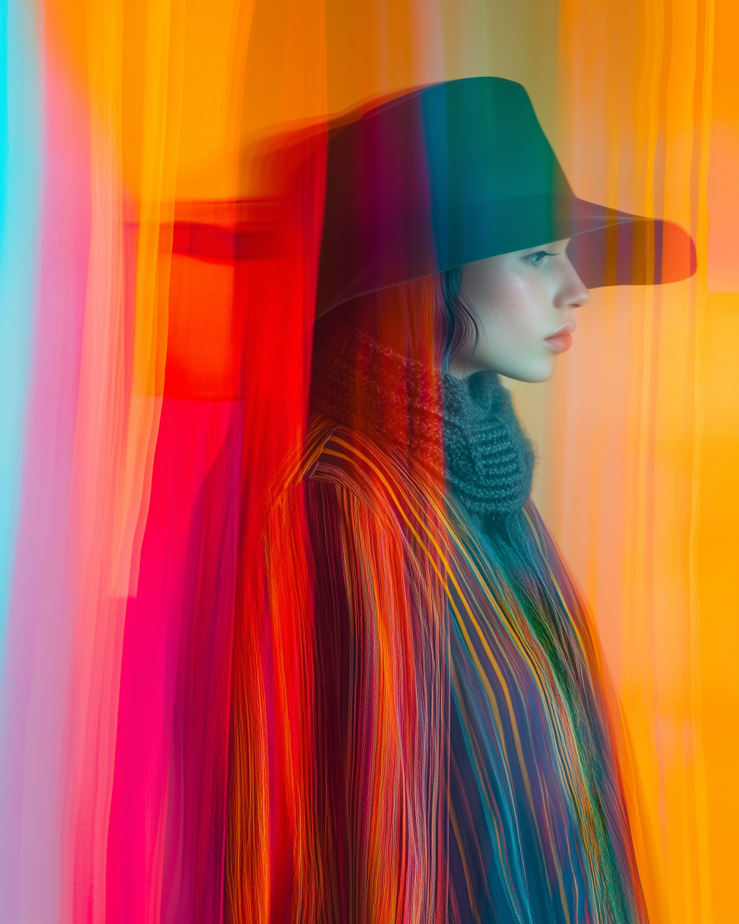 A woman in a wide-brimmed hat with a colorful, dynamic background of flowing hues, creating an artistic and vibrant scene.