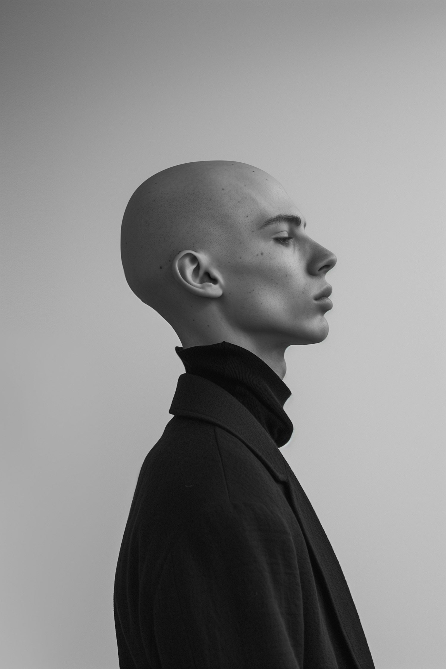 Minimalist black-and-white profile portrait of a bald individual in a black turtleneck and blazer, showcasing sharp features and soft lighting.