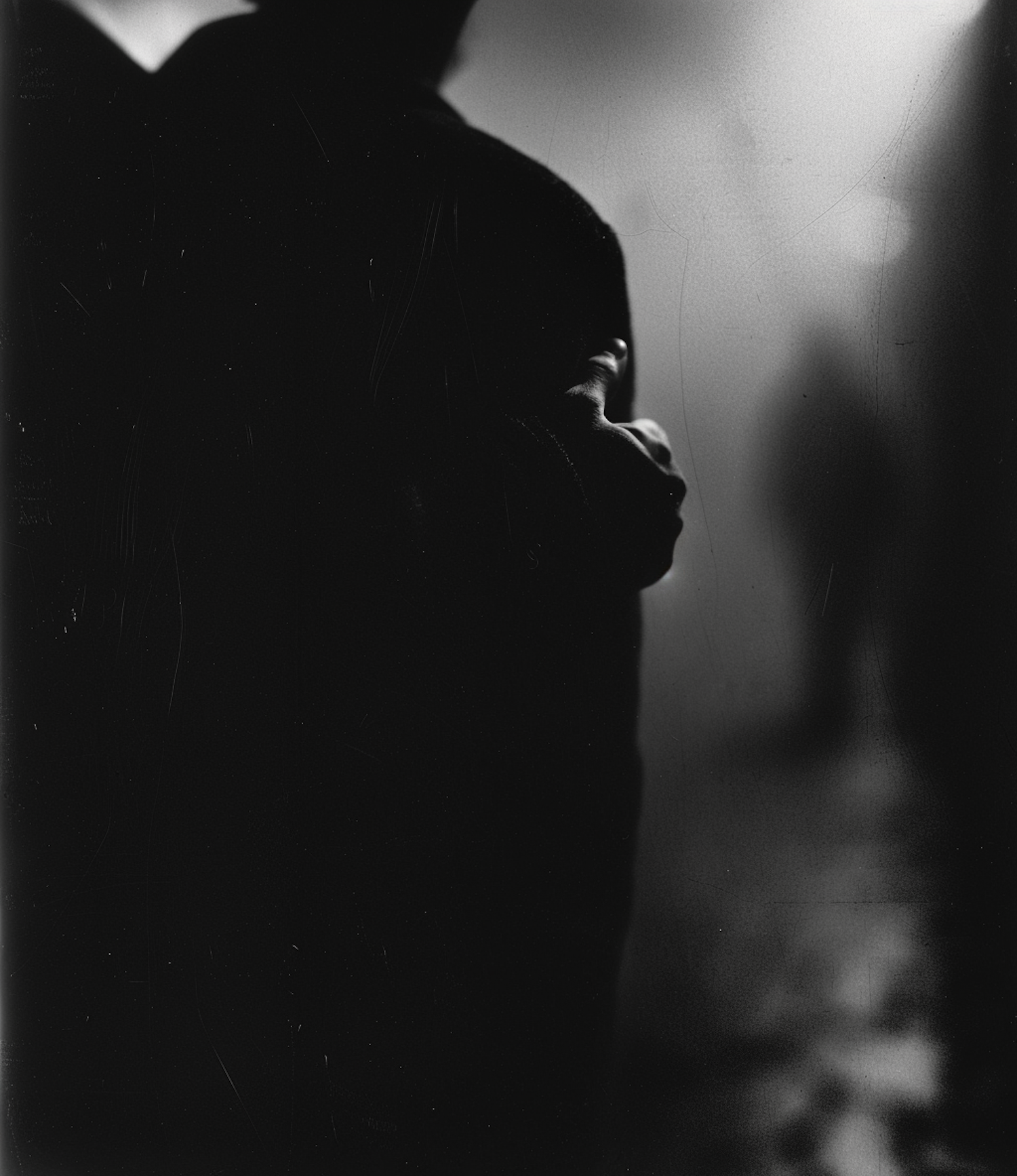 Moody black and white photo with a silhouetted figure and blurred background, creating a mysterious and atmospheric scene.