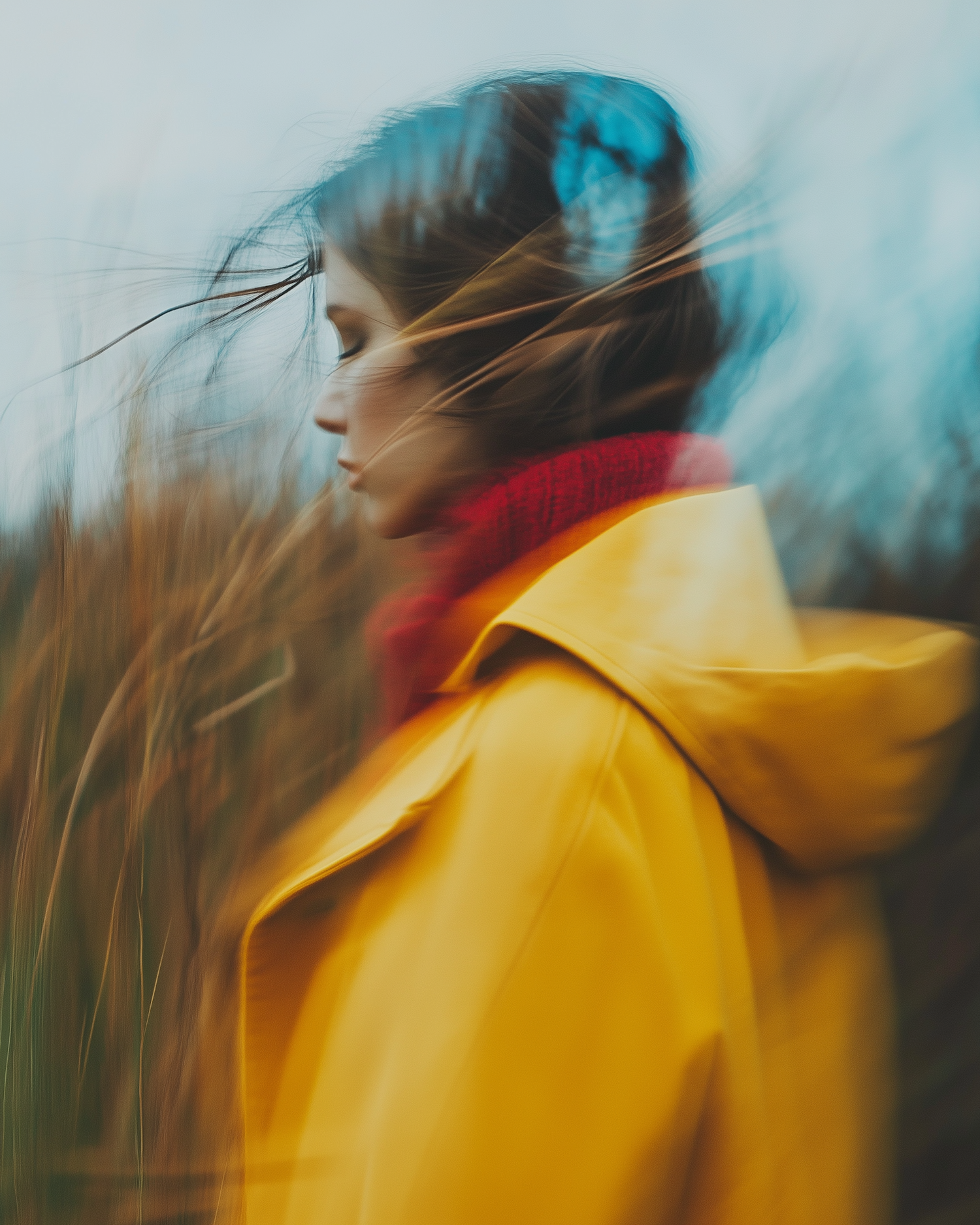 Blurred portrait of a person in a yellow raincoat and red scarf, with windblown hair, creating a dreamy and dynamic effect.