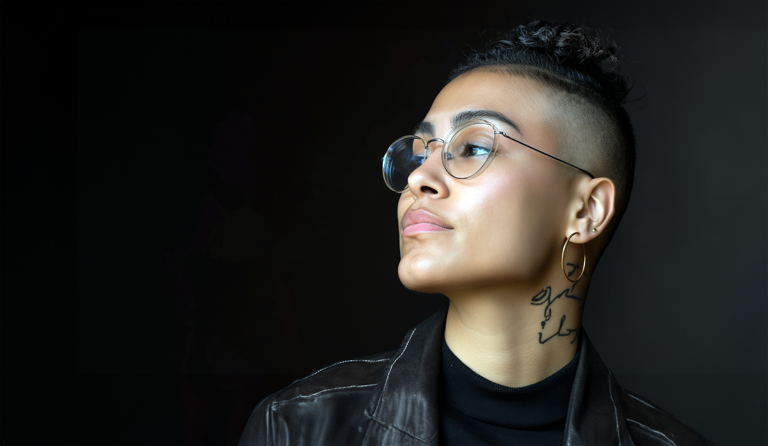 Confident person with glasses and neck tattoo in a leather jacket, set against a dark background.