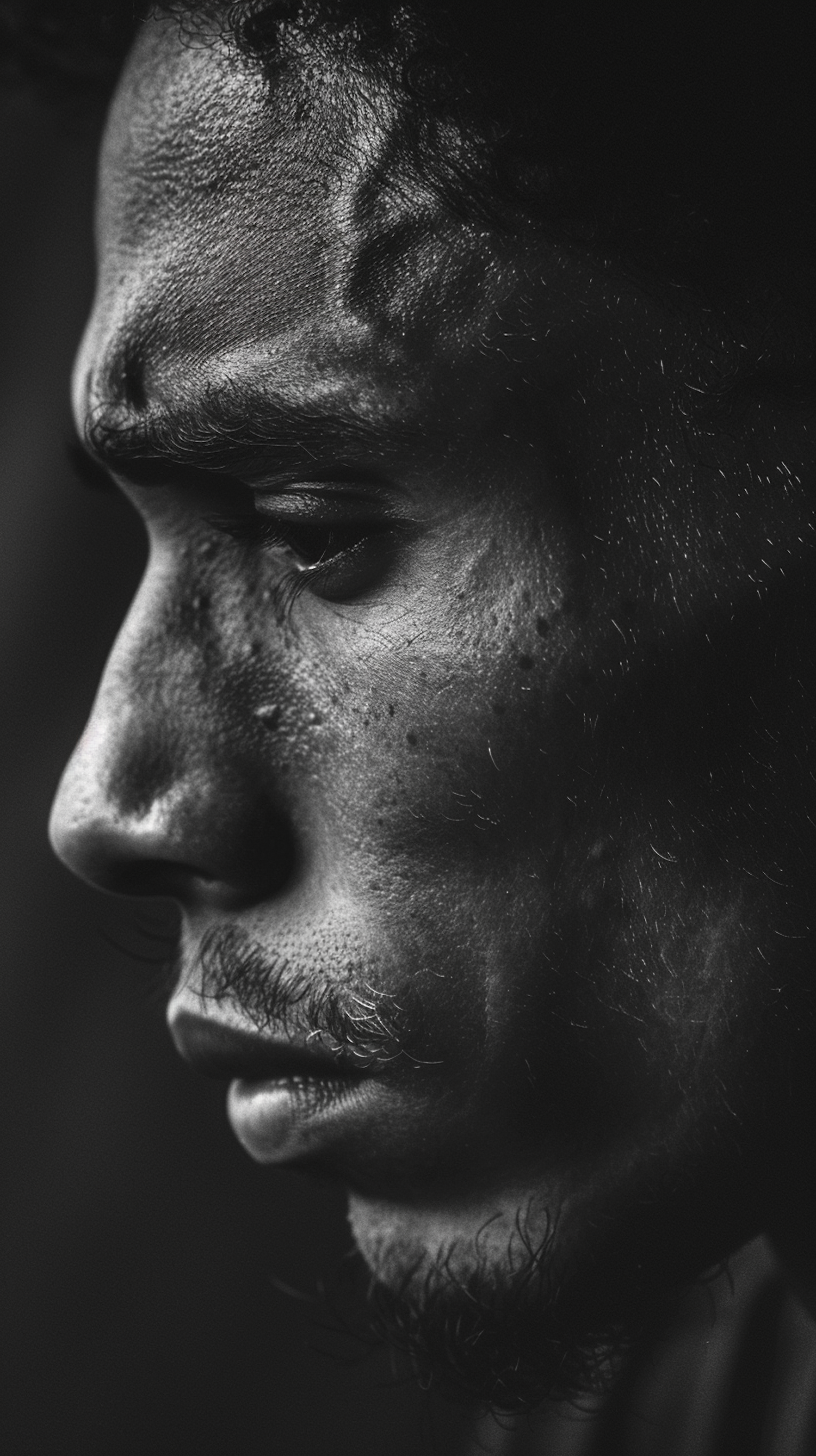 Black and white close-up portrait of a man with curly hair and contemplative expression, highlighting skin texture and facial hair.