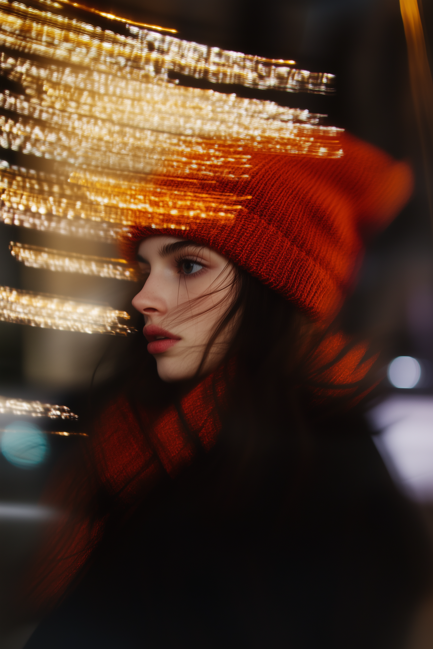 A young woman in an orange hat and scarf gazes contemplatively amidst dynamic golden light streaks.