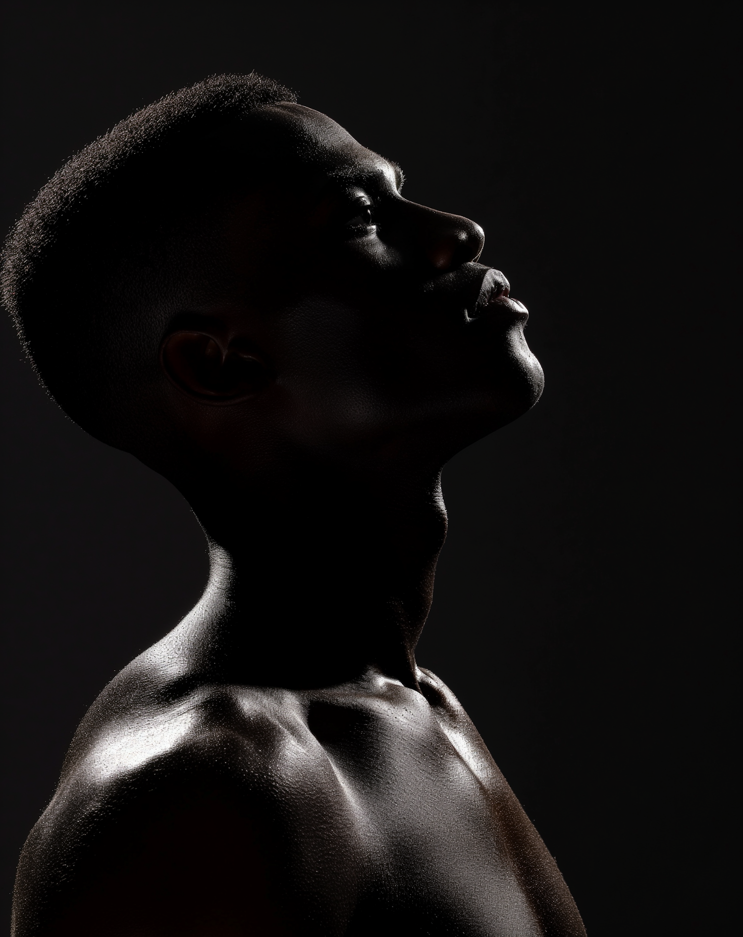 Dramatic profile portrait of a Black man with dark skin, highlighted by striking lighting against a black background.