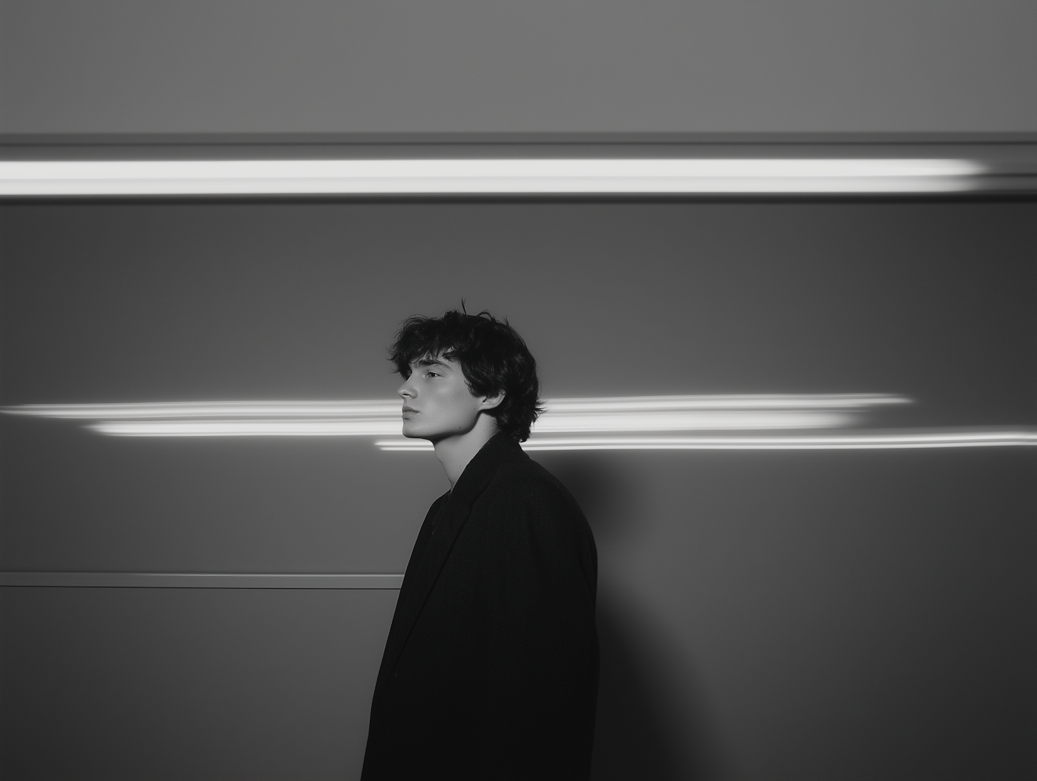 Monochromatic portrait of a young man in profile with dynamic light streaks on a minimalist gray background.