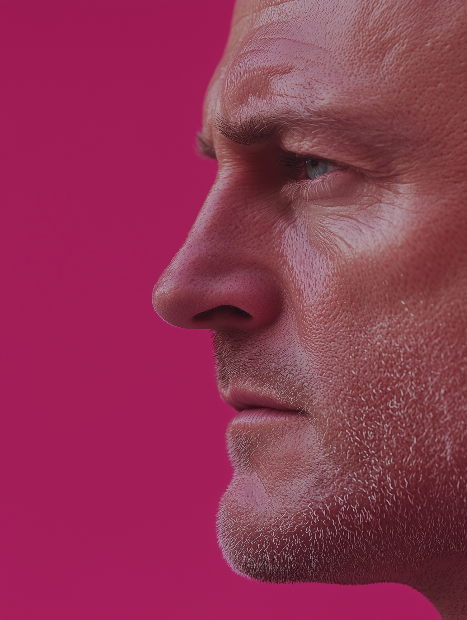 Close-up side profile of a Caucasian man with intense gaze against a vibrant pink background, highlighting facial texture and expression.