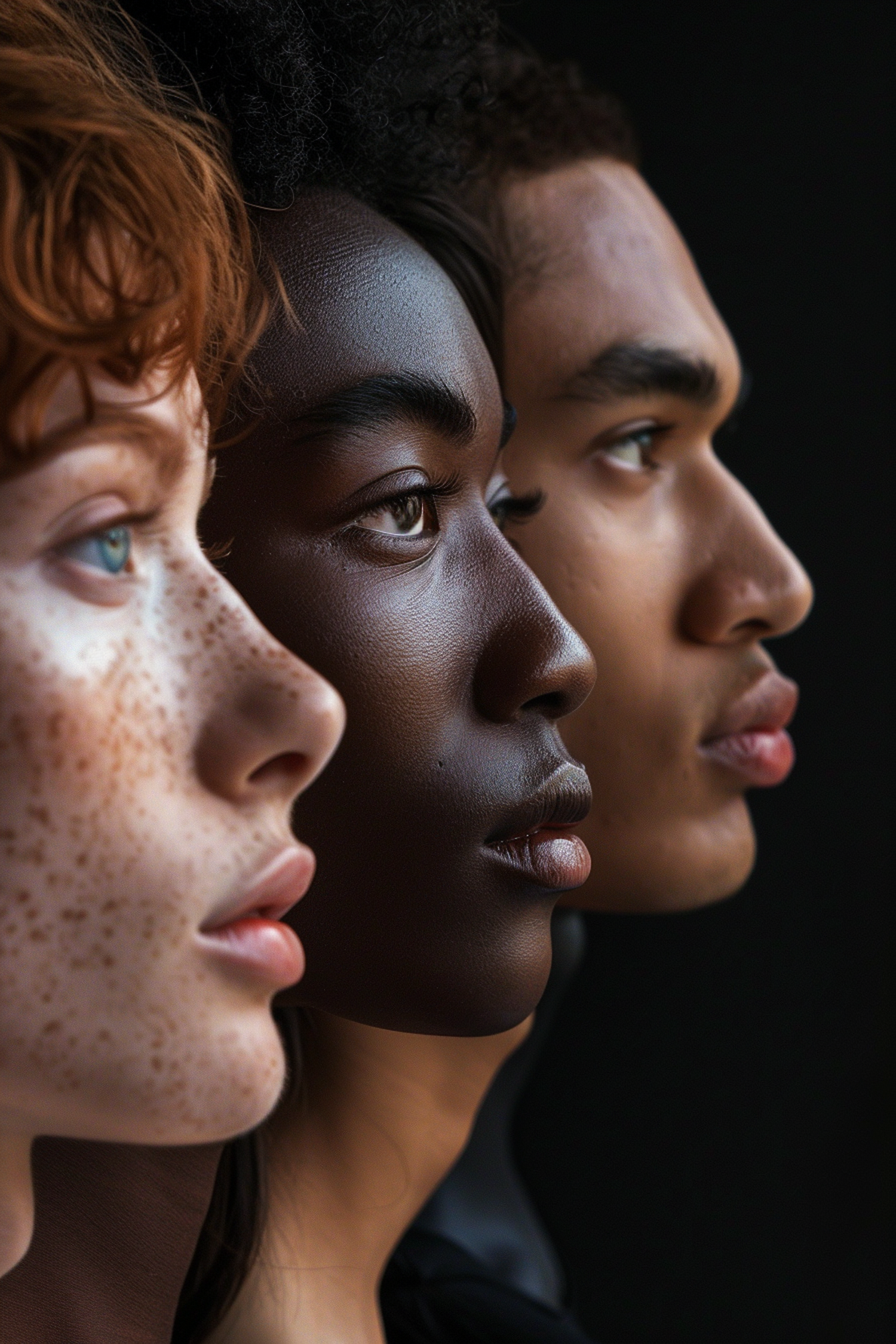 Three diverse individuals in profile, showcasing unity and diversity with distinct skin tones and features against a dark background.