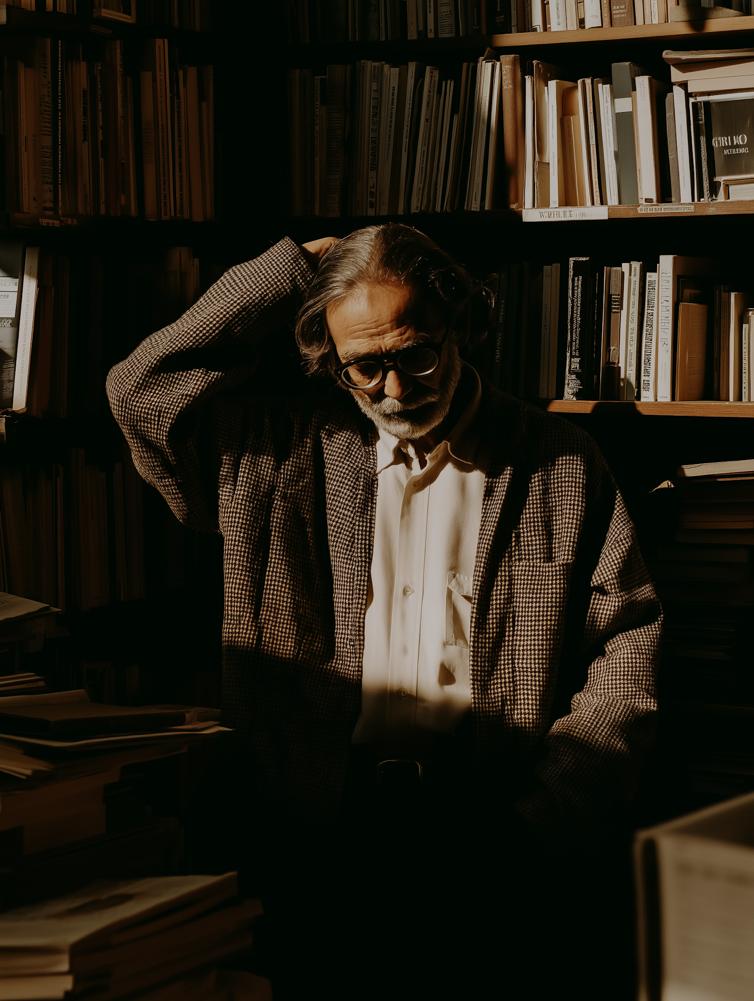 A thoughtful person standing among bookshelves, warmly lit and surrounded by books, creating an introspective and peaceful atmosphere.