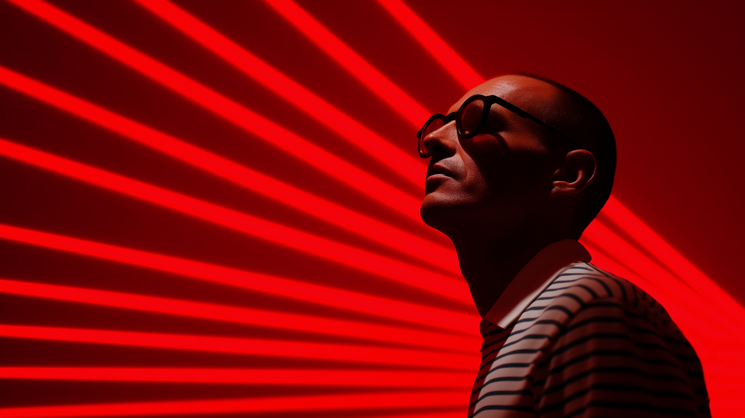 A man in glasses and a striped shirt gazes upward against a dramatic red background with radiating light beams.