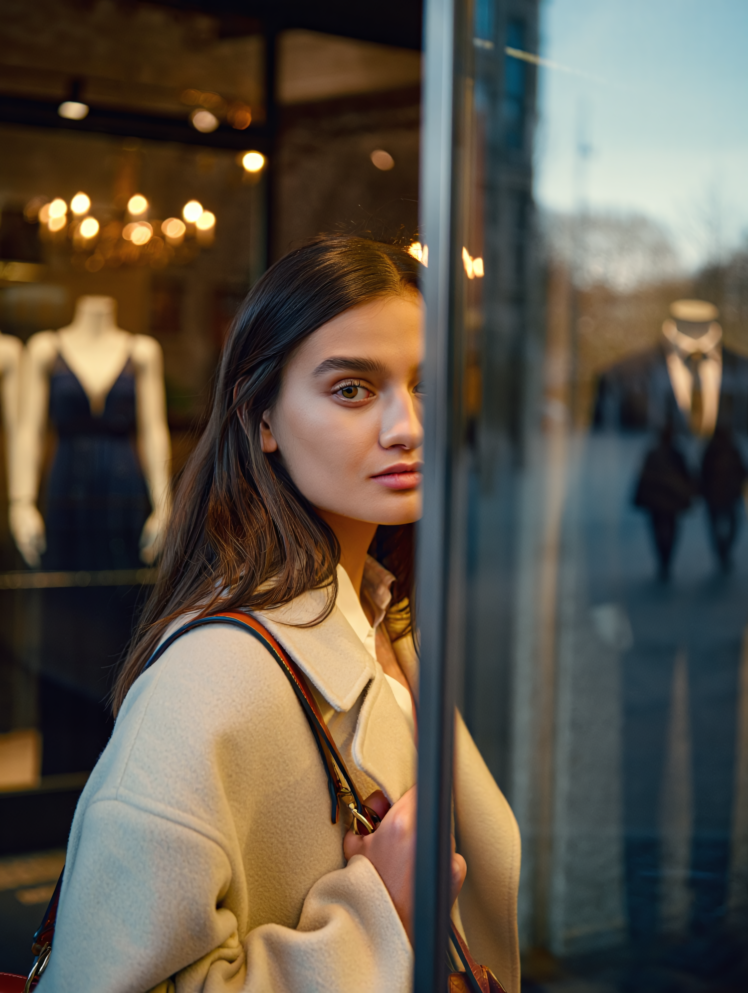 A young woman in a beige coat stands by a glass window, with a store display and sunset reflections creating a warm, urban ambiance.