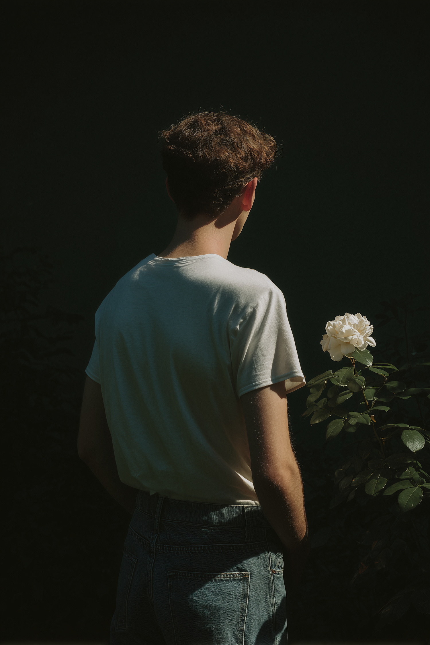 A person in a white t-shirt and jeans stands near a blooming white rose, with dramatic lighting and a dark background.