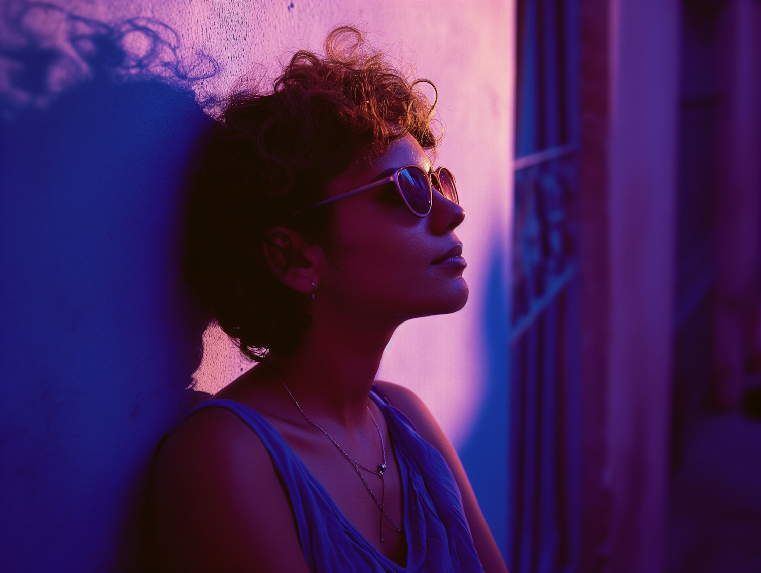 Woman in sunglasses leans against a wall in vibrant purple and pink lighting, creating a serene and contemplative mood.