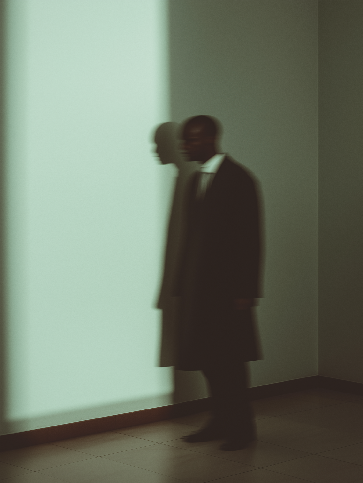 Blurred image of a man in a dark coat casting a shadow on a greenish wall, creating a mysterious and ethereal atmosphere.