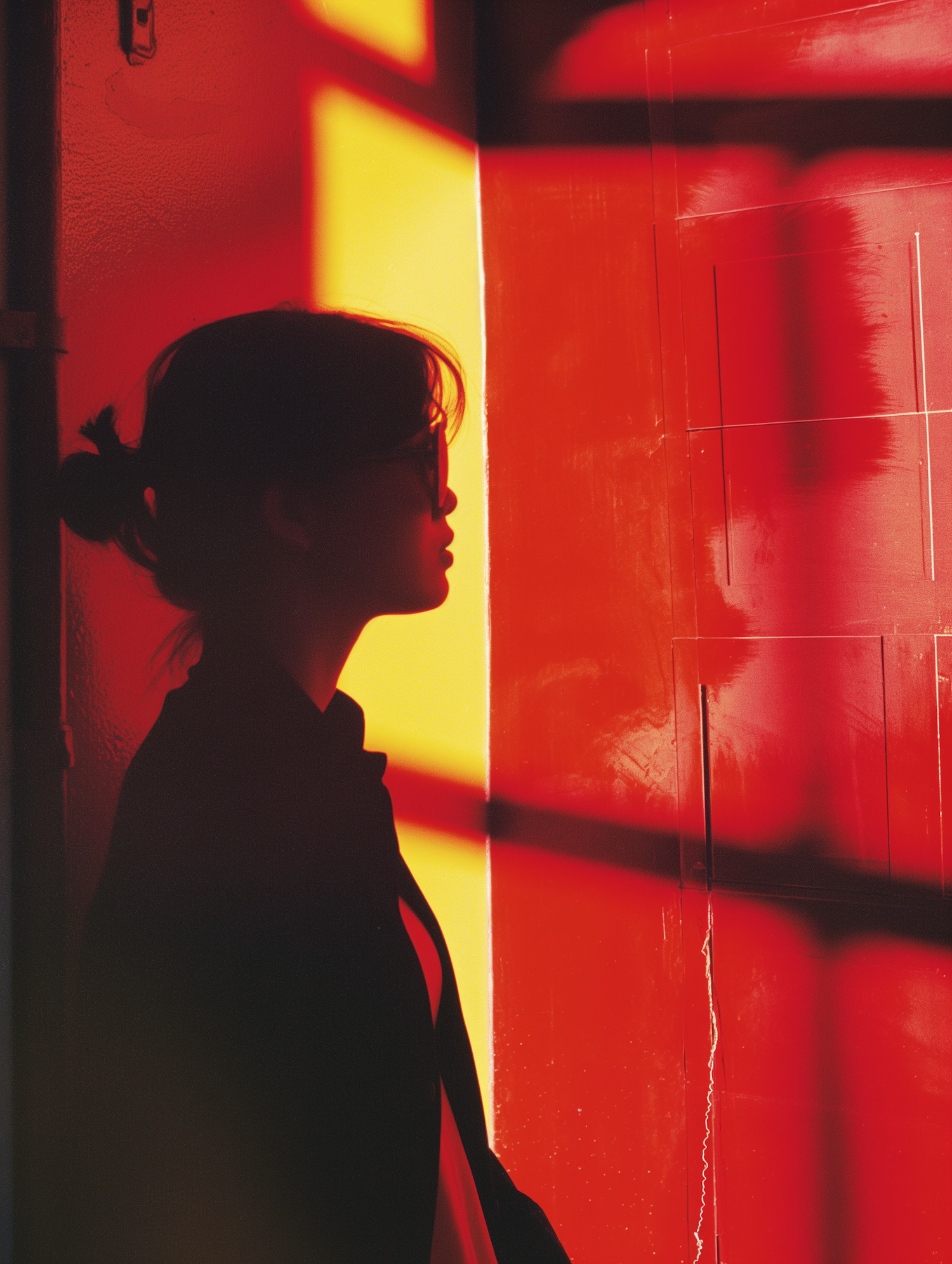 Silhouette of a person against a vibrant red and yellow background with dramatic shadows.